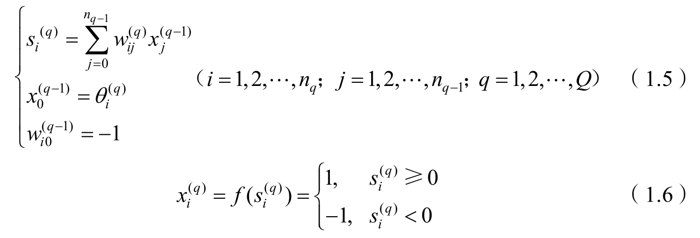 这时每一层相当于一个单层前馈神经网络。例如,第 q 层,它形成一个 n q -1 维的超平面,对该层的输入模式进行线性分类,由于是多层的组合,最终可以实现对输入模式的较复杂的分类。