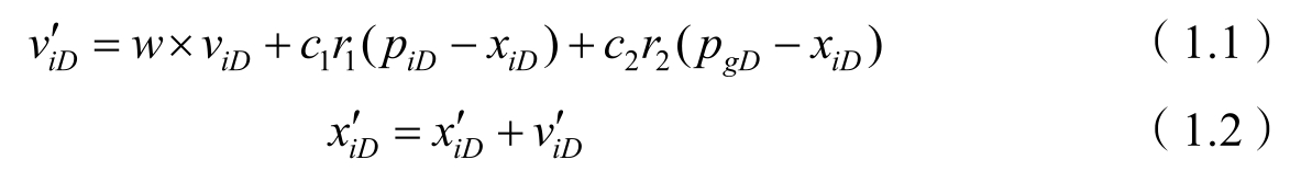 式中, c 1 、 c 2 为学习因子,也称为加速常数(Acceleration Constant); w 为惯性因子; r 1 、 r 2 为[0,1]内的均匀随机数。式(1.1)右边由三部分组成。第一部分为惯性(Inertia)或动量(Momentum)部分,反映了粒子的运动习惯(Habit),代表粒子有维持自己先前速度的趋势;第二部分为认知(Cognition)部分,反映了粒子对自身历史经验的记忆(Memory)或回忆(Remembrance),代表粒子有向自身历史最佳位置逼近的趋势;第三部分为社会(Social)部分,反映了粒子间协同合作与知识共享的群体历史经验,代表粒子有向群体或邻域历史最佳位置逼近的趋势。另外, i= 1,2,…, D , v iD 是粒子的速度, v iD ∈ [ -v max , v max ], v max 是常数,由用户设定,用来限制粒子的速度。