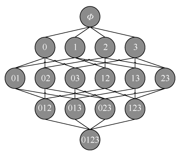 以商品购买为例,假设一家商店出售4种商品,分别为商品0、商品1、商品2、商品3,我们希望通过挖掘买家购买商品的订单数据,来决定进行促销的商品组合,可能的商品组合如图1.15所示。
