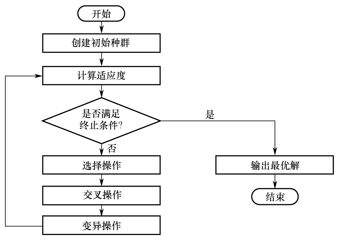 首先对优化问题的可行解进行数字化编码处理,其次随机创建初始种群,然后用适应度函数计算每条染色体的适应度,接下来进行选择操作获取较优的个体,再进行交叉和变异操作产生新的个体,避免陷入局部最优解,以更高效地寻找到全局最优解。遗传算法的流程如图1.5所示。