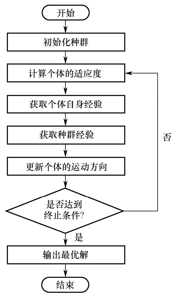 粒子群算法主要遵循邻近原则、品质原则、多样性反应原则、稳定性原则和适应性原则。其中,邻近原则是指种群中的个体可以进行简单的时空计算;品质原则是指种群可以对所处环境的品质因素产生反应;多样性反应原则是指种群应该在较大的范围内运动;稳定性原则是指当所处环境发生变化时,种群不必每次随之改变自身行为;适应性原则是指种群应该以付出较低代价为目的,适时改变自身行为。这些原则充分反映了此类优化算法中智能主体的自主性、反应性、学习性和适应性等智能特点。粒子群算法的一般流程如图1.4所示。