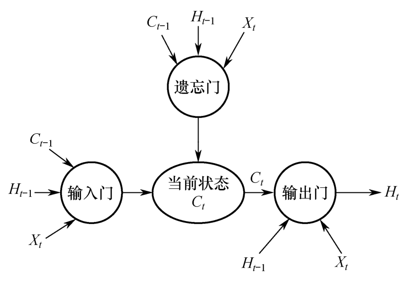 称为门是因为使用Sigmoid函数作为激活函数的全连接神经网络层会输出一个0~1的数值,描述当前输入有多少信息量可以通过这个结构。这个结构的功能类似一扇门,当门打开时(输出为1),全部信息都可以通过;当门关上时(输出为0),任何信息都无法通过。LSTM网络单元结构如图1.8所示。