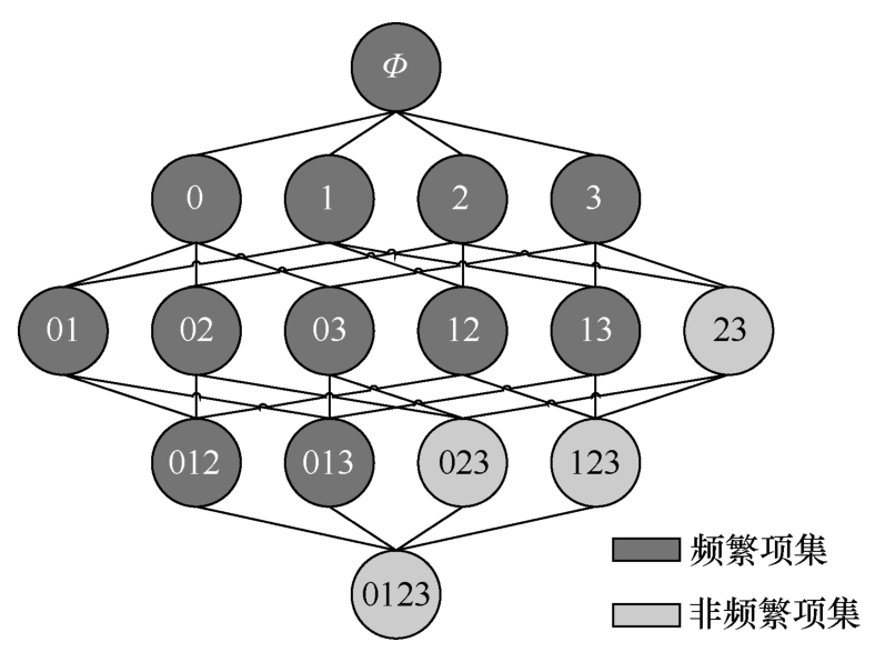 根据图1.16,我们知道项集{2,3}是非频繁的,那么它的所有超集也是非频繁的。在实际计算过程中,一旦计算出{2,3}的支持度不满足最小支持度,就不需要再计算{0,2,3}、{1,2,3}和{0,1,2,3}的支持度了,因为它们也都是非频繁项集。