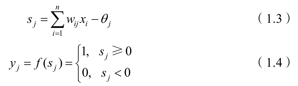 式中, x i 是输入特征向量 X 的分量, X = { x 1 , x 2 ,…, x n } T ; w ij 为 x i 到 y j 的连接权重;输出量 y j 是按照不同特征的分类结果; θ j 是偏置。