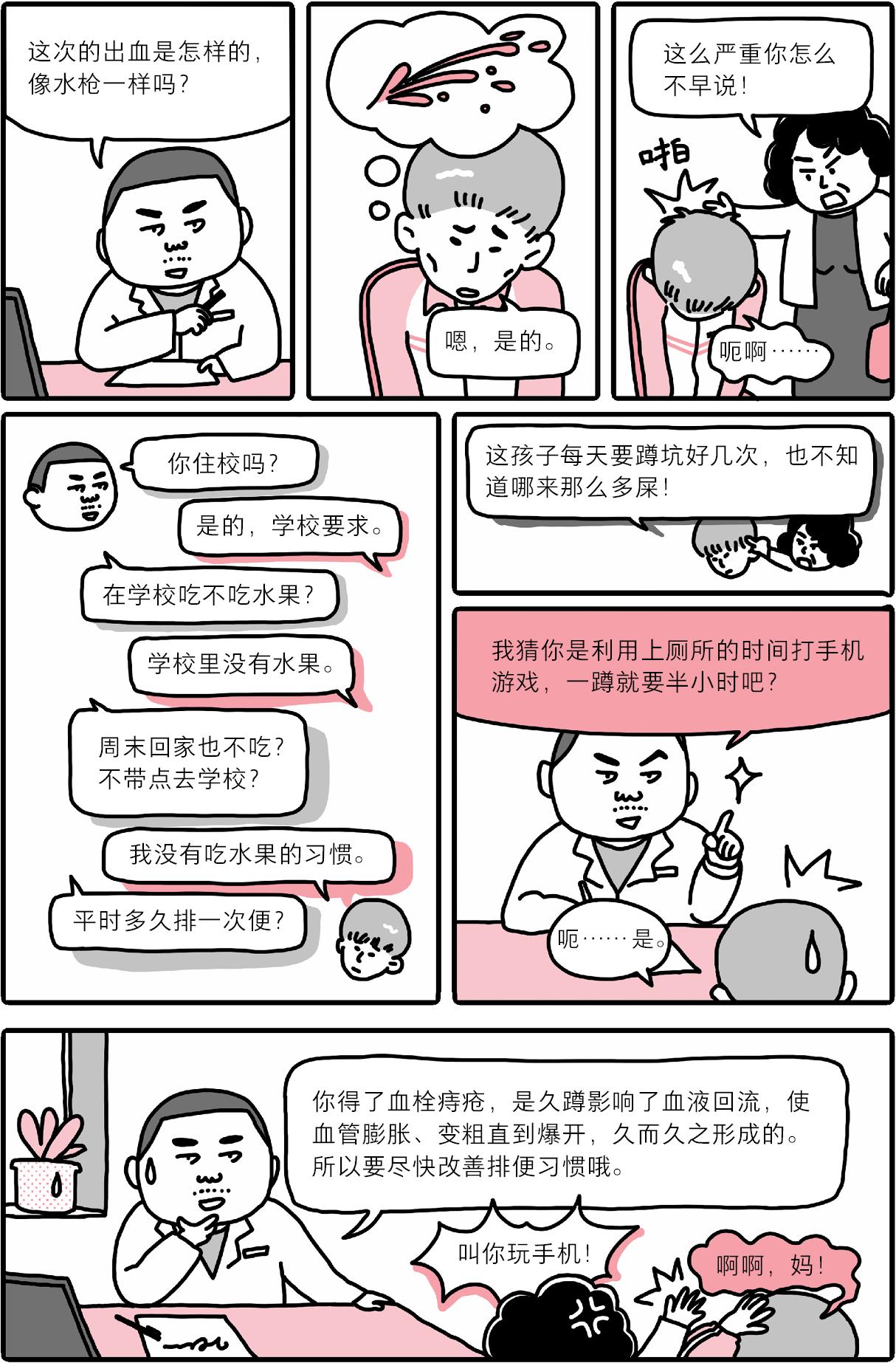 青少年得痔疮的情况并不少见。现在的年轻人患痔疮的最大原因就是蹲厕所时玩手机。孩子的爸爸妈妈也应该有这种生活经验,他们小的时候虽然没有手机来玩,但是有小说可看。有些人蹲厕所时可以读半本金庸的小说,有些人蹲厕所时可以翻完一整本杂志,甚至有的人会把卫生间装修得和图书馆一样,直接把书架钉在墙上。我经常对患者开玩笑,蹲厕所时玩手机或看小说,实际上就是在给肛肠科医生送生活费。