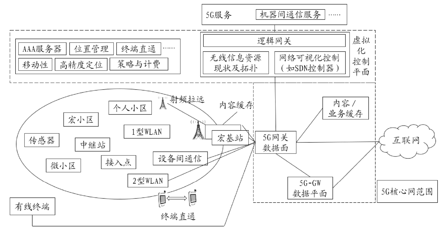 5G核心网控制面在虚拟环境下予以实现。虚拟逻辑网关包含网关控制功能,控制多个网关数据面交换机。控制面之下涵盖两大功能模块:一是无线资源信息功能模块,用来在所有可能的无线接入网中选择最佳可用的无线接入网,包括监视多个RAT的无线资源情况、基于信道条件的宏基站-中继站拓扑等;二是用来跟踪用户终端位置并识别该位置上的最佳可用的无线接入网的地理位置信息模块。
