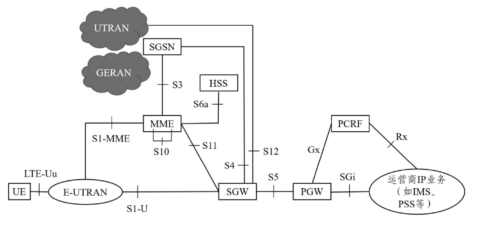 图1-10中,UTRAN为通用电信无线接入网;GERAN为全球移动通信系统边缘无线接入网;SGSN为GSM/GPRS/EDGE网络核心网的网元;HSS为归属用户服务器,负责管理用户的签约数据及移动用户的位置信息;MME为移动性管理实体,用于处理信令;UE为用户终端;LTE-Uu为长期演进技术的空中接口(实现终端与演进的通用电信无线接入网之间的通信);E-UTRAN为演进的通用电信无线接入网;S1-U为基站(eNode B,是E-UTRAN核心)与服务网关(SGW)之间的通信接口,-U表示用户数据部分;SGW为服务网关,用于处理业务流;PGW为分组数据网网关;PCRF为策略和计费规则功能;IMS为IP多媒体子系统;PSS为主同步信号;S1-MME为承担基站与核心网之间控制信令的接口;S3为SGSN与MME之间的接口,用于实现在3GPP网间进行交互,采用GTP-C协议,下层为UDP(用户数据报协议);S4为SGSN与SGW之间的接口,提供GPRS网与SGW之间的相关控制和移动性管理功能;S5为SGW与PGW之间的接口,可以分为控制面和用户面;S6a为HSS与MME之间的接口,用于完成用户接入认证、插入用户签约数据、对用户接入PDN(公用数据网)进行授权,以及与非SGPP系统互联时对用户的移动性管理消息的认证等功能;S10为MME之间的控制面接口,完成MME再分布和MME之间信息的传输;S11为MME与SGW之间的接口,用于传输承载控制与会话控制等信息;S12为UTRAN与SGW之间的用户面接口;Gx为PCRF与PCEF之间的接口,PCEF在PGW中,提供QoS准则和计费标准的传输功能;SGi为PGW与分组数据网络之间的接口,包括IMS核心网、外部公共或私人数据网,类似于Gi接口;Rx为PCRF与AF(应用功能)之间的接口,AF位于业务平台。