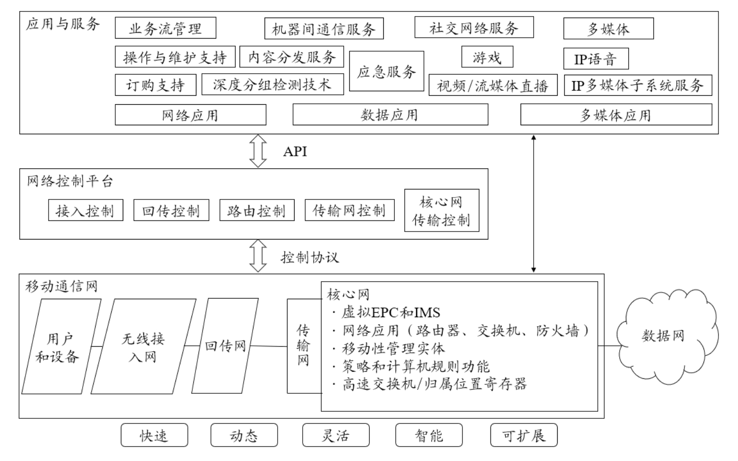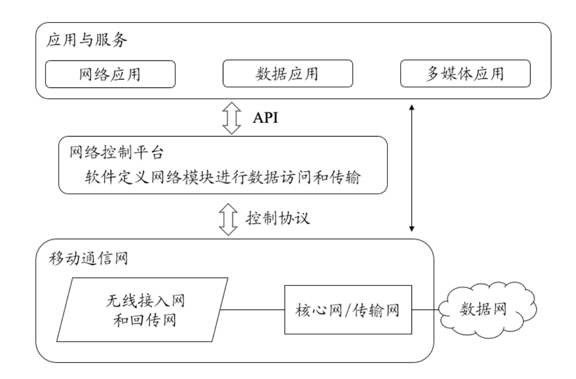 第二层是网络控制平台,面向第一层的各类移动通信应用,执行面向应用系统的网络控制功能,同时为下一层的移动通信网提供相关服务。由于网络控制编程在软件定义的基础上是可配置的,因此网络控制平台具有自动化、动态化、灵活化、智能化和可扩展的网络操作优势。