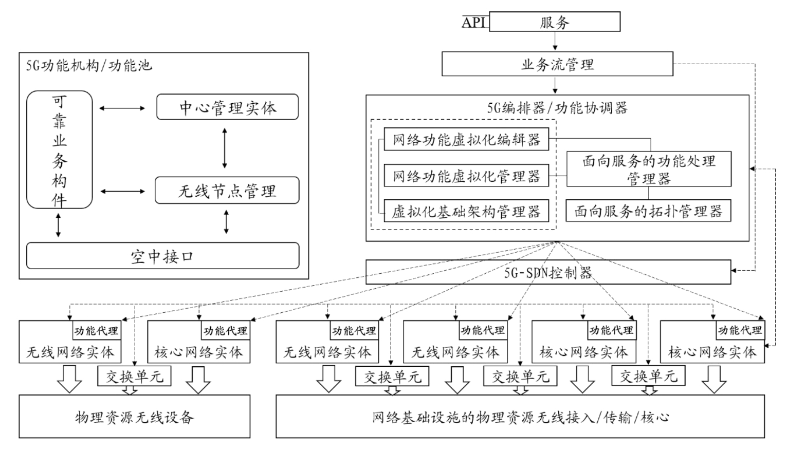 业务流管理的任务是,通过网络基础结构分析服务并总结目标业务数据流的要求,随后与5G编排器和5G-SDN控制器通信,两者负责在最终功能部署中实现所需功能。这种架构使依据需求定制虚拟网络成为可能,虚拟网络使用共享资源池且允许控制面与用户面的有效业务自适应解耦,优化整个业务传送链上的路由和移动性管理。