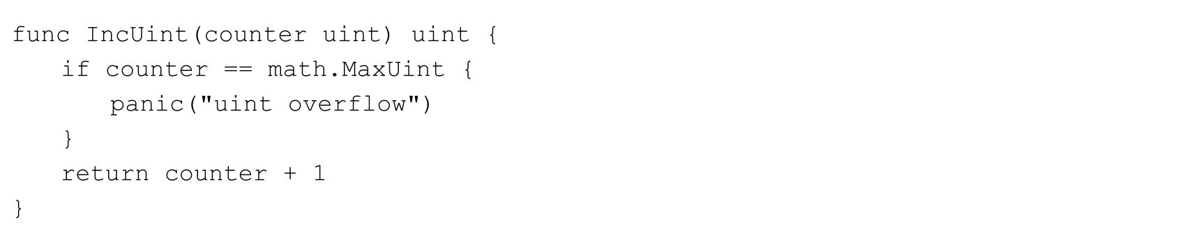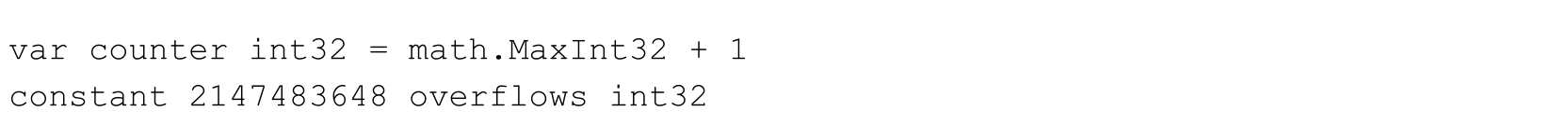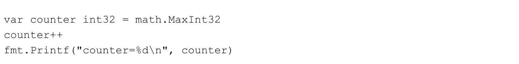 如果我们想在基于已定义大小的类型(int8、int16、int32、int64、uint8、uint16、uint32或 uint64)的整数的增量操作期间检测整数溢出,可以使用math常量检查该值。例如,对于 int32类型的整数: