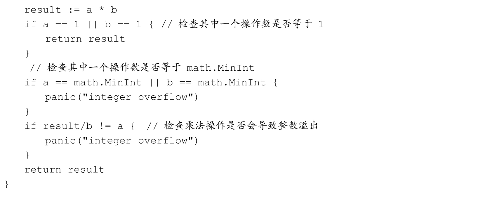 乘法操作处理起来有点儿复杂。我们需要使用最小整数 math.MinInt 来执行检查: