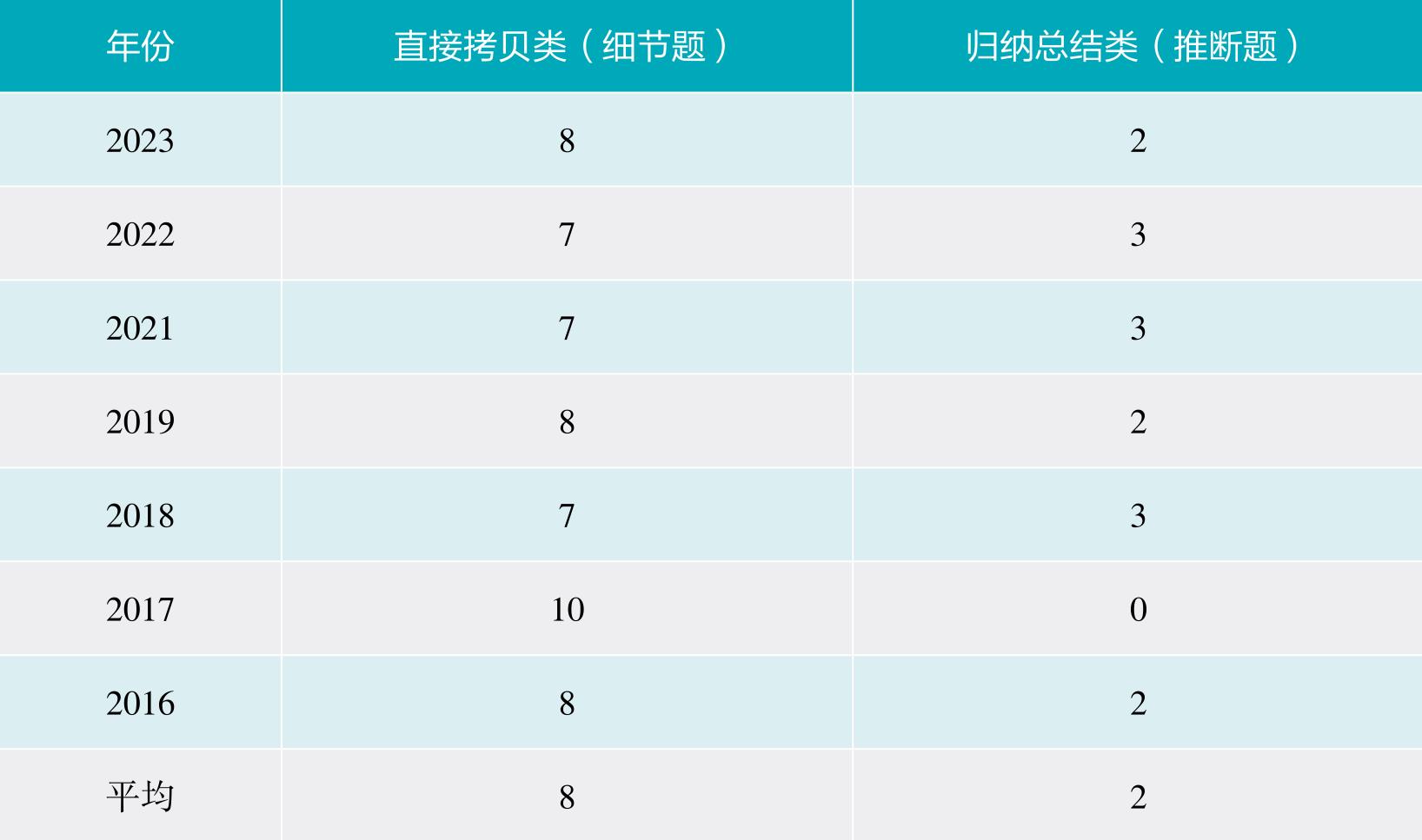 从上表可以看出,近几年听力中的讲座题设题点,细节题差不多占79%,推断题占21%,也就是说,小讲座试题的答案大部分都是可以直接从原文中获取的,只有一小部分试题的答案需要通过对所听到的内容进行理解、归纳、推理后才能得出。