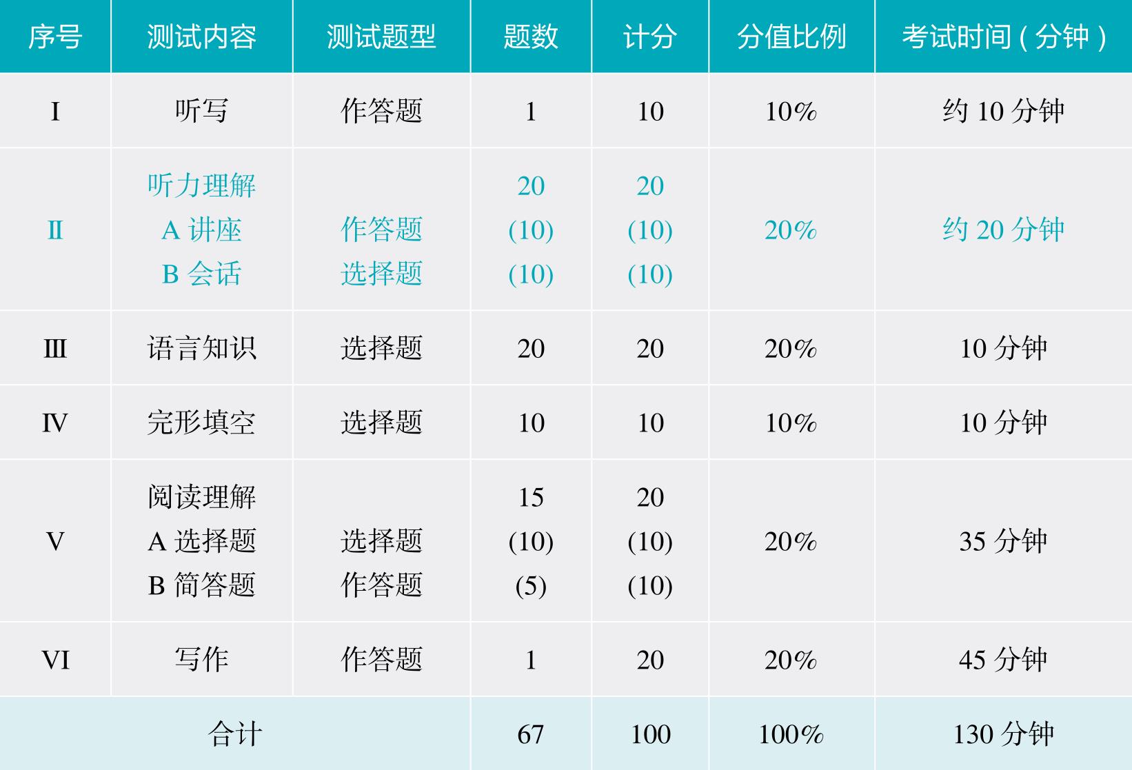 专四考试内容、题型、题数、计分、分值比例和时间列表