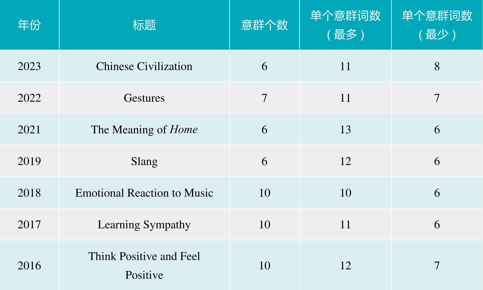 由上表不难看出,意群个数从2019年开始出现下降的趋势,2022年又略有增加,但是单个意群的单词数量比较稳定,最多的在10~13个词之间,最少的在6~8个词之间。