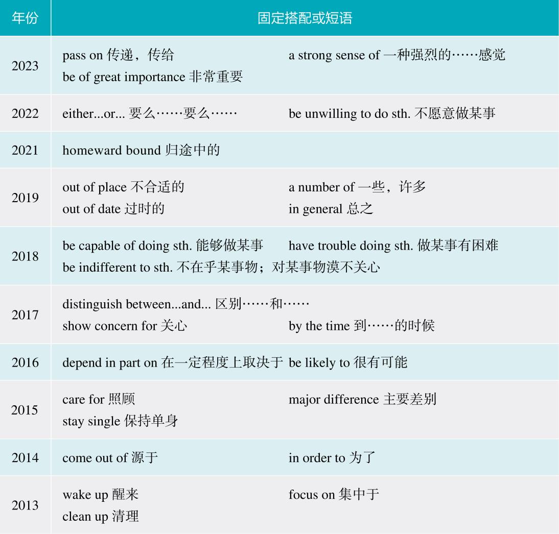 固定搭配的拼写错误主要是指考生因对某些固定短语、词组、常用谚语和俗语掌握不牢、记忆不清而导致误写或漏写单词。下表列举了近10年专四真题听写材料中的固定搭配或短语: