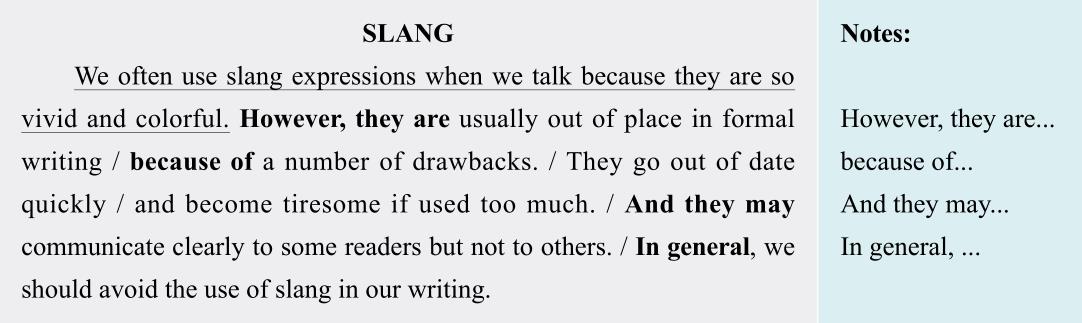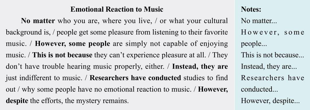 在听第一遍录音时,我们可以大致记下如以上表格右栏所展示的主要内容。可见文章的逻辑衔接词并不多,根据记下的重点词我们可以大致了解文章的结构和大意。在听第二、三遍时逐步填充空缺的内容即可。