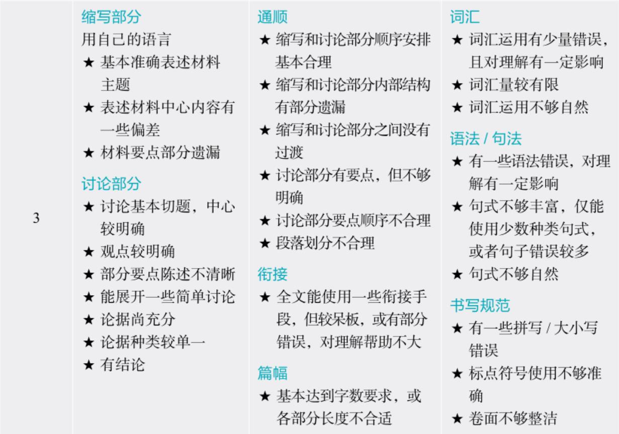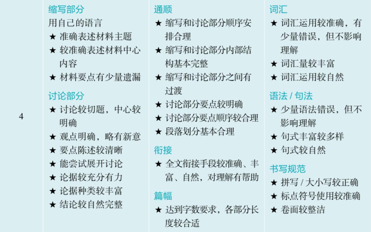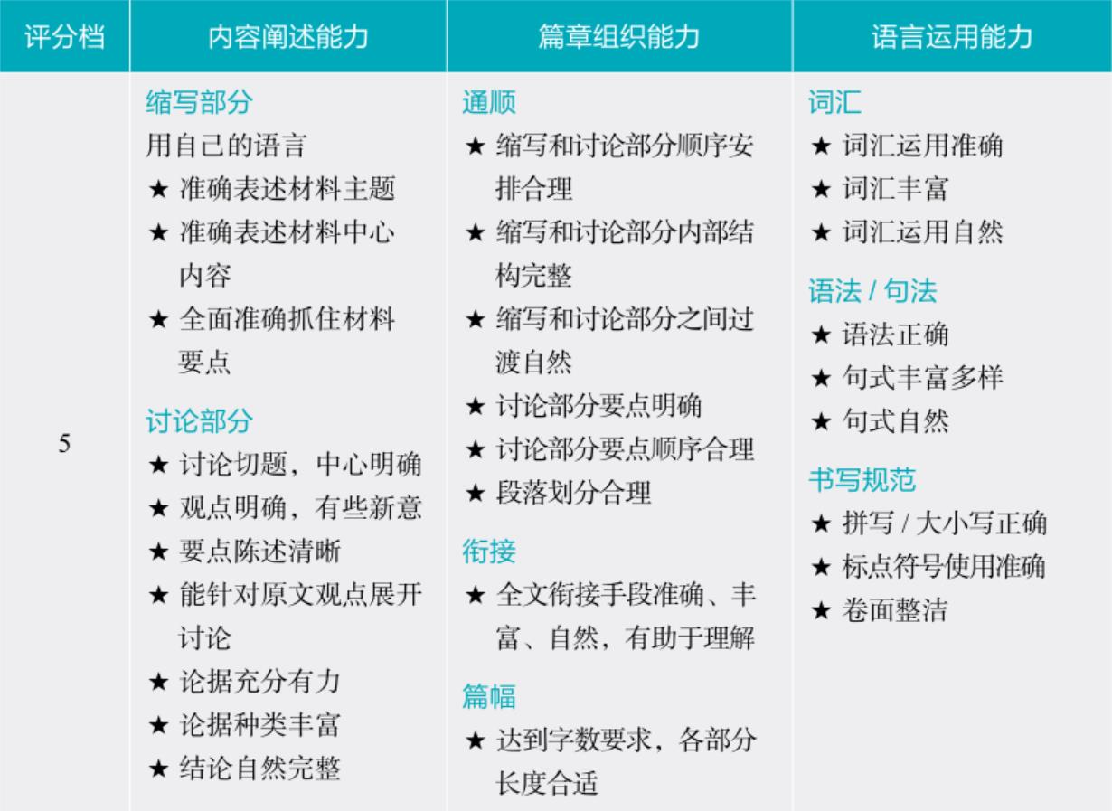 关于“内容阐述能力”的评分,“缩写部分”强调用自己的语言准确表述材料主题和中心内容;“讨论部分”强调根据材料提出自己的观点,提供有理有据的论点,充分论证。
