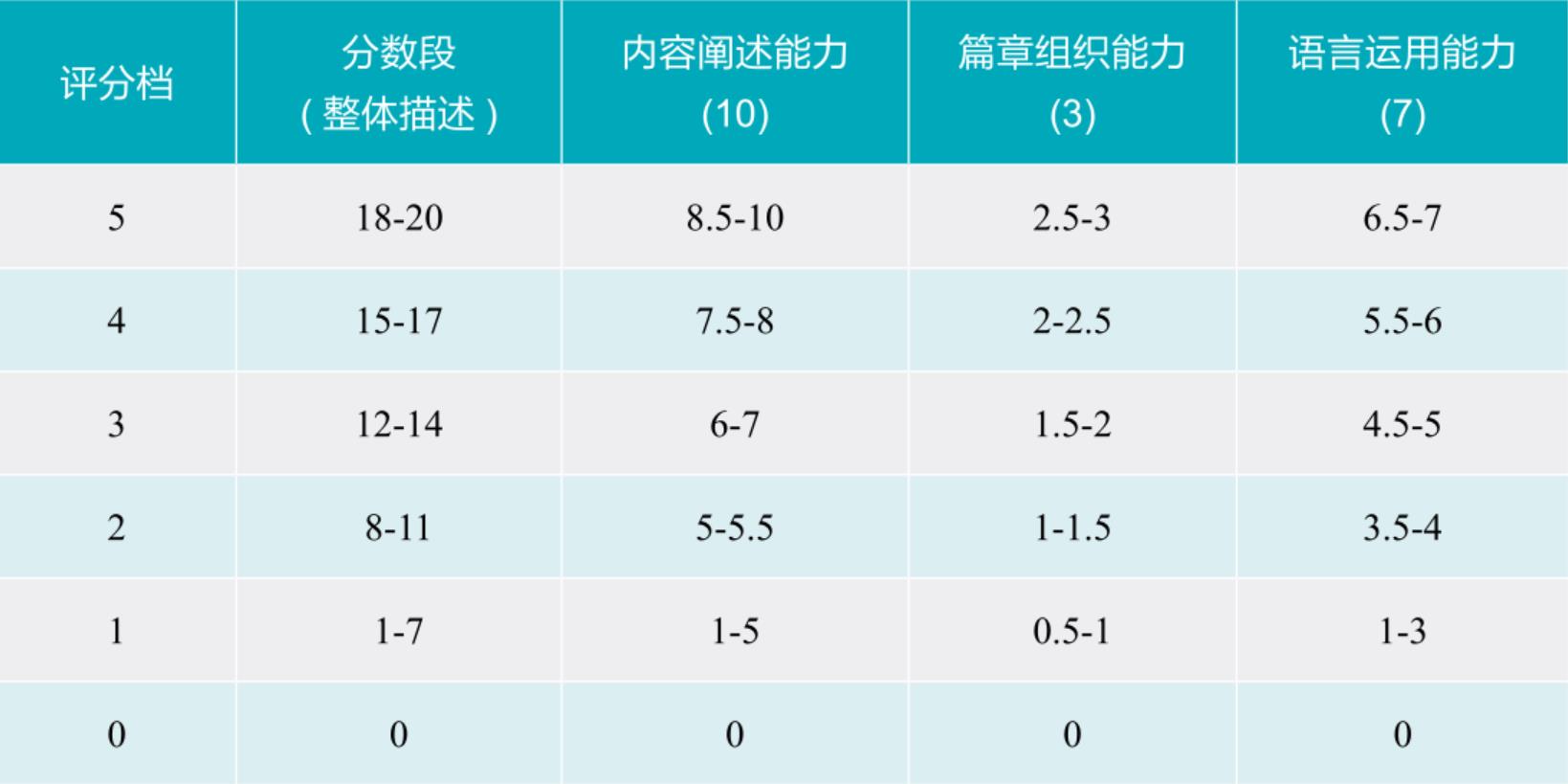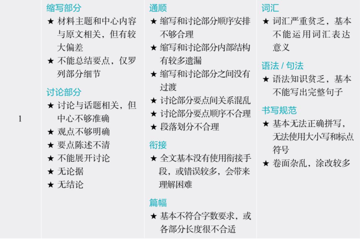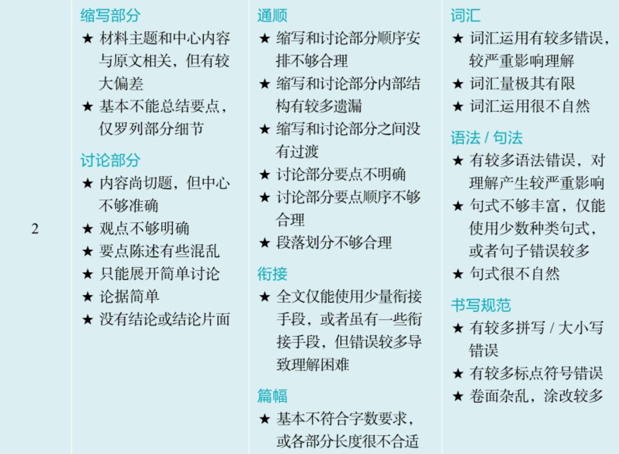 关于“内容阐述能力”的评分,“缩写部分”强调用自己的语言准确表述材料主题和中心内容;“讨论部分”强调根据材料提出自己的观点,提供有理有据的论点,充分论证。