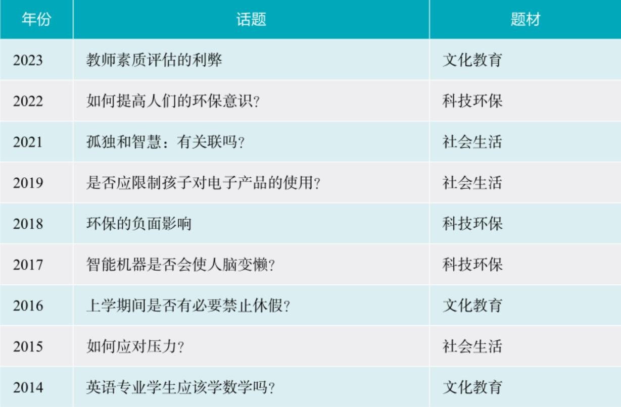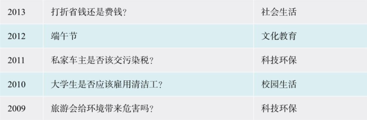 通过分析近十几年的专四写作真题题材可以看出,专四写作的题材具有很明显的现实意义,基本上都是考生所熟悉的题材,主要涉及四个方面:社会生活类、文化教育类、科技环保类和校园生活类。