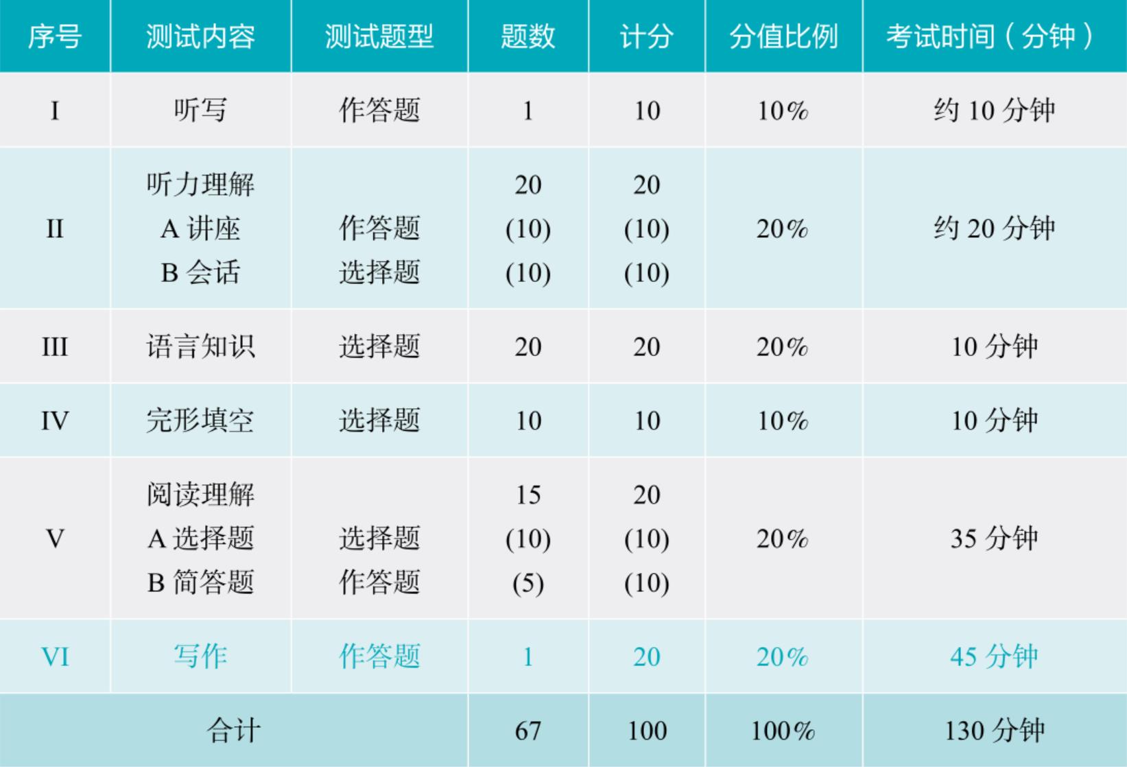 专四(TEM4)考试内容分为六个部分:听写、听力理解、语言知识、完形填空、阅读理解、写作。整个考试用时130分钟。