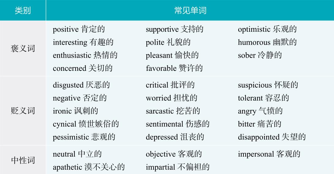 议论文中,文章的中心句一般会暗示作者的态度;说明文中,作者的态度往往比较中立;叙述性文章中,往往不直接提出观点,但作者写作时却常带有某种倾向性,所以要求考生在读这种文章时要细心捕捉能够表达或暗示情感态度的单词或短语,捕捉那些烘托气氛或渲染情感的词句。