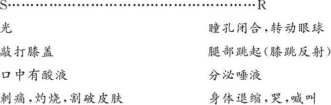 到目前为止,我们描述的方法是非常简单的。我使大家觉得,引起反应的必要刺激,好像是一种实体,只是在某个地方等着研究者将它找出来并呈现给被试。我也将反应描述得好像是一种固定的东西或实体,当有机体被刺激的时候就会产生。只要稍微对现象有所观察,就知道事实并非如此,以上说法并不准确,公式是需要调整的。我在第一章中曾讲过,有些刺激在最初的时候似乎没有产生明显的效果,即使有,也与它们后来所发挥的效果不一样。让我们用公式来说明这一点。以一个已经固定(非习得)的反应为例,其刺激和反应已知,公式如下: