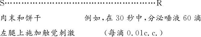 【31】假设在一个特定情形中,我们试图用触觉刺激引起唾液分泌的反应。我们会在狗的左大腿上施加4秒触觉刺激,然后间隔4秒或5秒以后施加无条件刺激——肉末和饼干。连续应用该程序大约两个月,每天对狗进行4~10次触觉刺激,每次刺激后停顿7~45分钟。两个月结束时,刺激的替代就会形成,触觉刺激(条件刺激)将会像肉末和饼干(无条件刺激)一样导致分泌同样多的唾液。