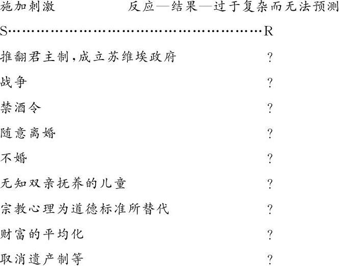 另一程序(2)是:“我们想要这个人或这群人做某件事,但是我们不知道如何安排一种情境使他做这件事。”这里的程序稍微有些区别。社会通过盲目地尝试错误进行实验,但是反应是已知和合法的。操作刺激不是为了观察通常会发生什么,而是为了引起特定的行为。你们也许无法很清楚地了解这两种程序之间的差别,我们借助一些例子也许会更好理解。首先,我们都得承认,社会实验目前正以很快的速度进行着——对于轻松自在的凡夫俗子来说,正以惊人的速度进行着。我们以战争作为上述第一种程序的社会实验例子。任何一个人都无法预言,当一个国家发生战争时,该国采取的反应将会带来什么变化。这里处理刺激的方式是盲目的,其盲目的情形就像一个小孩推倒他费尽心思才建造起来的积木一样。