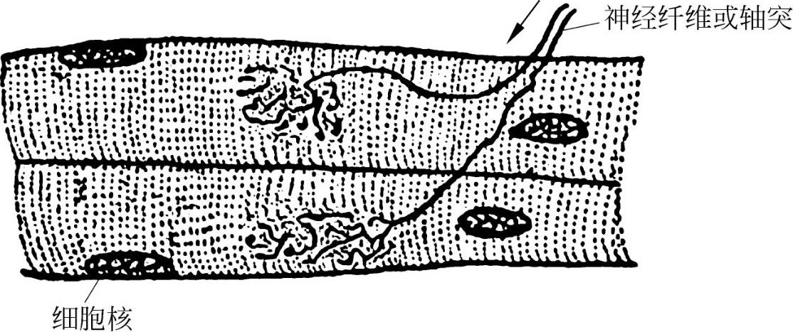 图4:两个不完整的横纹肌肉细胞,其中有运动神经的末梢