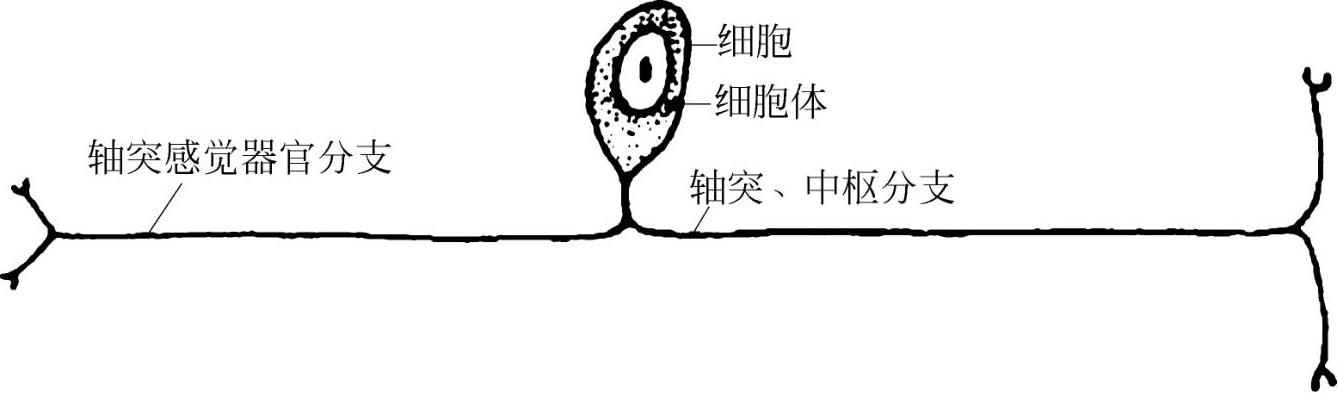 这种神经元没有枝状突起——轴突分为两枝,一枝终止于感觉器官中,另一枝终止于中枢神经(就是大脑或脊髓)中。
