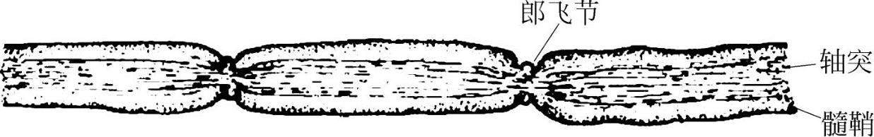 图7:轴突的一个部分。轴突由许多微细的丝构成,位于长条的神经分支的中心,在外面黑色的部分,是髓鞘。髓鞘在一些一定的距离上,收缩起来,这些收缩的地方,称为郎飞节(nodes of Ranvier)