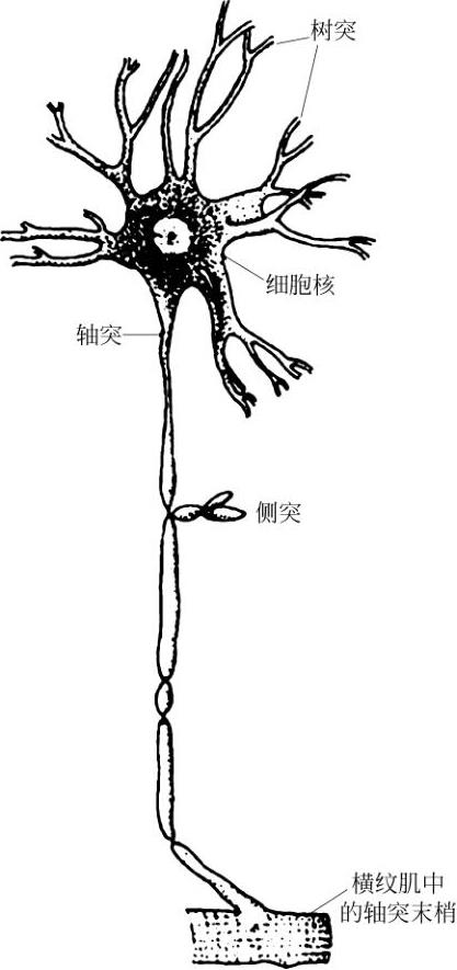 就一般的构造而言,神经细胞与人体的其他细胞并无差异。每个神经细胞都由一个细胞体及其旁枝或突起组成——这些突起的数量有时很少,有时很多。我们以脊髓(所谓低级运动神经)(见图6)上的某个细胞为例,它有一个包含细胞核的细胞体。在细胞体四周有许多短小的旁枝从主体四周伸出来。我们将这些旁枝称作树突(dendrites),因为它们看起来就像树干上的枝杈。细胞体【64】上的某处会有一条细长的纤维延伸出来,距离或长或短(有短到零点几英寸的,也有长到几英尺的)。这一细长的旁枝称作轴突(axis-cylinder)。在轴突上往往还会长出一些旁枝,称作侧突(collaterals)。在整个轴突(包括它的侧突)表面有一层脂肪保护层(称为髓鞘[medullary sheath])(轴突的细节参见图7),而树突上没有这种脂肪层。以上所描述的是细胞及其突起,它们通常被称为神经元(neurone)。这些细胞有多种形状,有些只有一个突起,例如,脊髓的传入神经元(afferent neurones)(这些细胞具有通过脊髓联系感官的作用——其细节可参见图8)。神经元是一切神经组织的基本单位。正如我们所知道的那样,神经元构成了大脑和脊髓。