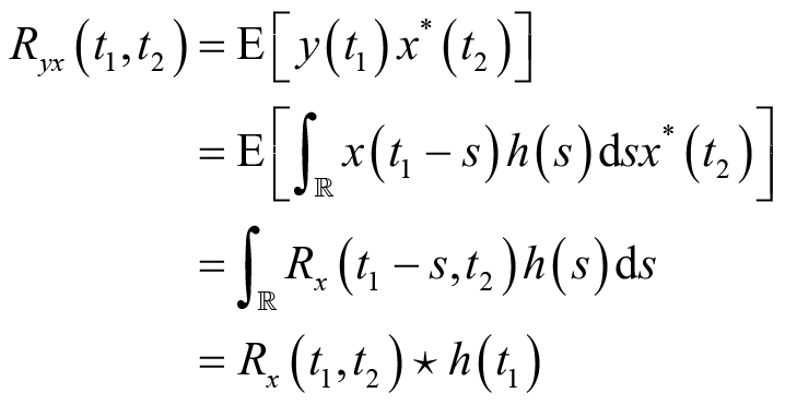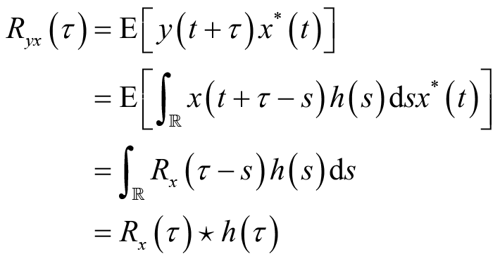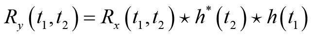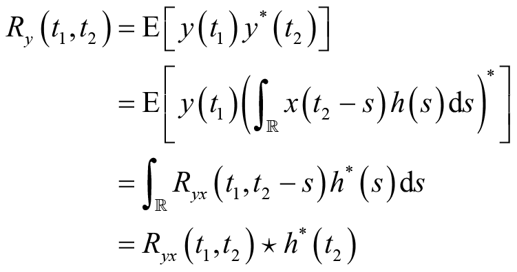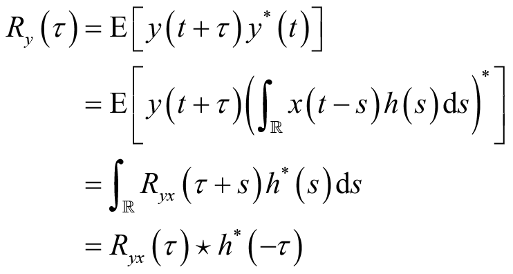 由此可知,输出信号的自相关可以通过输出信号的自相关函数和系统的冲激响应得到,而不需要输出信号的二维概率分布函数。特别地,当输入信号是宽平稳随机过程时,等式(2.33)、等式(2.34)和等式(2.35)所表示的输出信号与输入信号的互相关函数和输出的自相关函数分别简化为