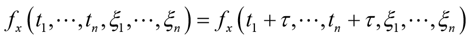 由此类推,可通过随机过程在3个或多个时刻的统计特性得到高阶平稳随机过程的概念。但是,它们在实际应用中较少出现,在此也不做介绍。现在介绍严平稳随机过程的概念。对于随机过程
