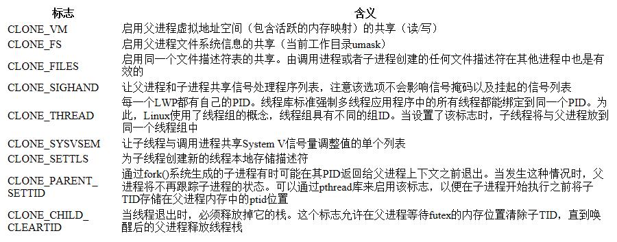当进程尝试通过pthread库创建线程时,会使用以下标志(见表1-1)调用clone():