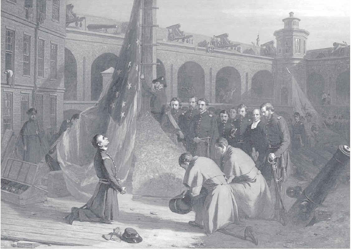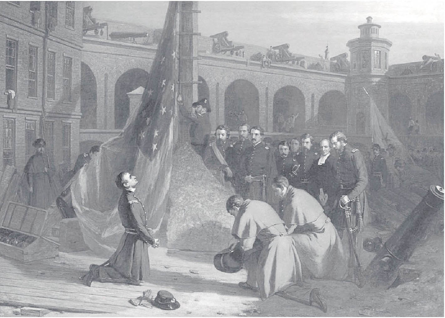 1861年4月13日中午过后不久,当萨姆特堡的旗杆被炮弹击中,当驻军的枪声沉寂下来之后,皮埃尔·古斯塔夫·图坦特·博雷加德将军耀武扬威地要求罗伯特·安德森少校投降,罗伯特·安德森少校随后表示接受。第二天,也就是1861年4月14日,星期日,罗伯特·安德森少校通过令人印象深刻的仪式降下了联邦的旗帜,率领着忠诚的驻军离开了萨姆特堡,并登上了一艘驶往纽约的汽船。