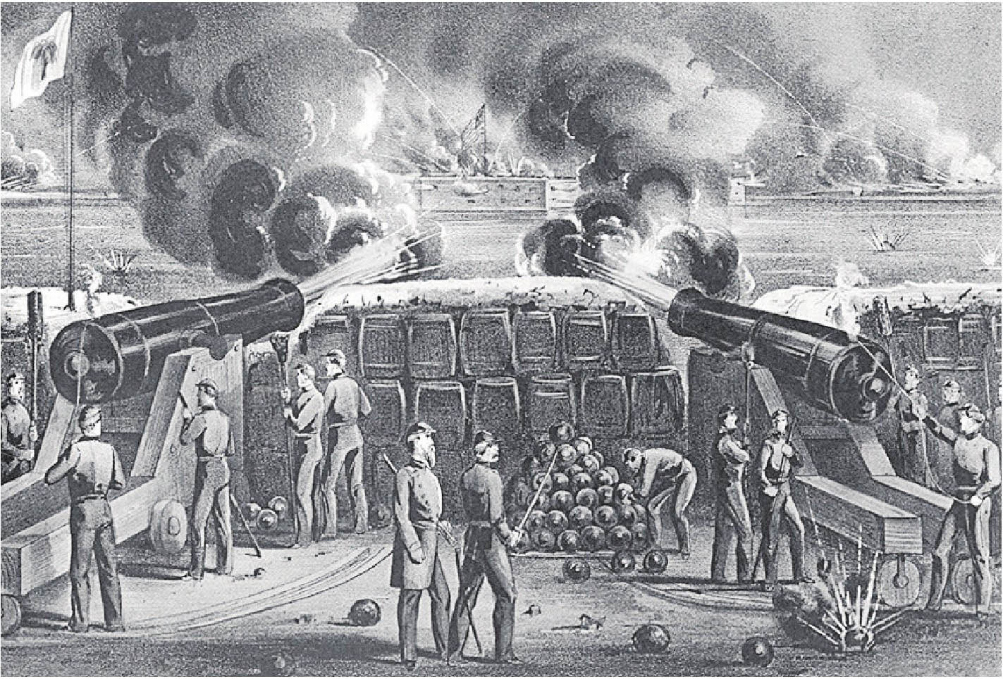 轰炸开始了。如前所述,叛军的围城工事修建在形成港口的岛屿的岬角上,距离从一千三百码到两千五百码不等,共有十九个炮台,配有四十七门大炮,还有一支由四千到六千名志愿者组成的陆上援军。双方力量悬殊。虽然萨姆特堡长三百五十英尺、宽三百英尺,有着坚固的城墙和砖砌的炮台,但没能为这样的一场冲突做好充分的准备。在它的四十八门可用的大炮中,只有二十一门在炮台上,其余二十七门在城墙上。驻军由九名委任的军官、六十八名非委任的军官和士兵组成,还有八名军乐队的成员和四十三名工匠,围城的叛军迫使这些非战斗人员滞留在这里,以期达到加速消耗萨姆特堡的食品给养的目的。