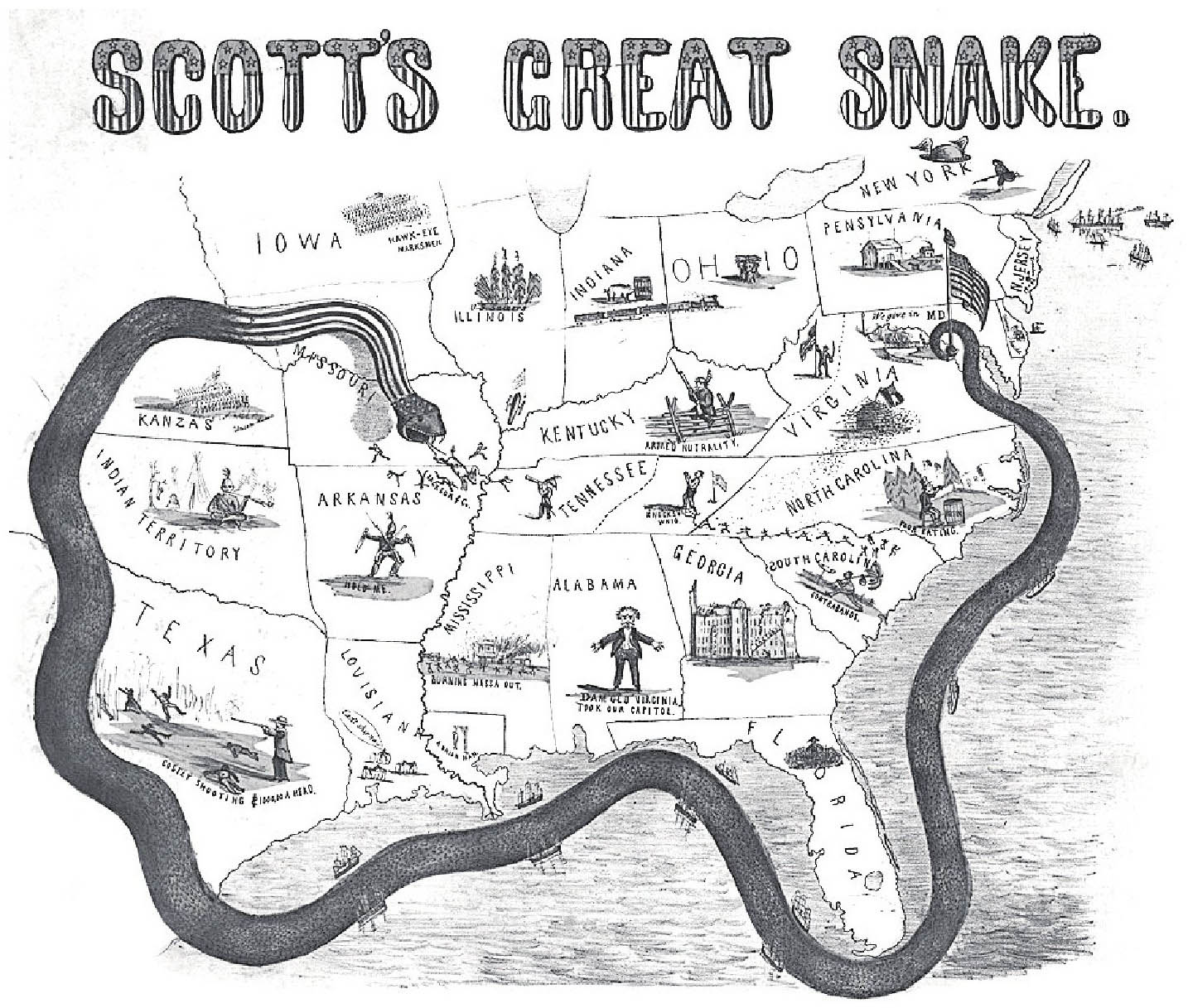 温菲尔德·斯科特将军的军事天才和经验从一开始就非常正确地勾勒出军事行动的宏伟计划,这对于让叛乱的南方诸州重新效忠联邦政府是很有必要的。早在计划布尔郎战役之前,他就敦促,不能依靠最初的七十五个兵役期为三个月的民兵团开展大规模的战役,因为他们还没达到训练有素的地步,就将服役期满。因此,他的主要建议是,将新组建的兵役期为三年的志愿军安置在十到十五个运作良好的营地里,并给予至少四个月的训练和战术指导。当海军通过严密的封锁,关闭了南方各州沿海的所有港口时,准备充分的军队就应该以不可战胜的纵队沿密西西比河南下至新奥尔良,沿途布防坚固的军事哨所和警戒线,以保持河道的畅通,并辅之以封锁,从而通过强大的军事力量将叛乱的主要地区包围并控制起来,最终完全而有效地镇压叛乱。然而,即使在提出这项计划的同时,温菲尔德·斯科特将军也承认,采用该计划的最大障碍将是忠诚和爱国的联邦的人民和领导人们缺乏耐心,他们将拒绝等待实施这一计划必需的时间。
