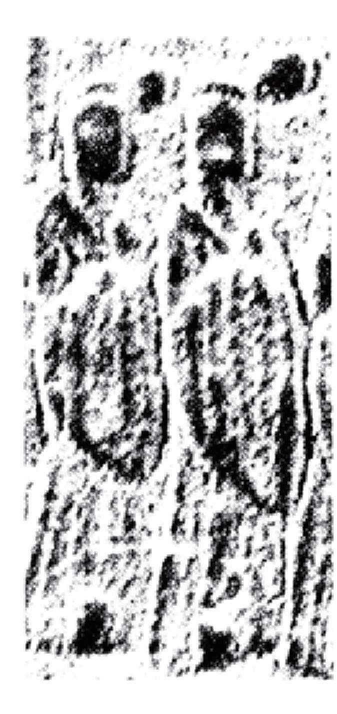 第38窟北壁和西壁下层礼佛图中供养人梳高髻(见图10)。供养人将头发高高拢在头顶束住,寥寥数笔刻画出整个发髻。一般在规模较小的佛龛中,常常以刻画出高髻的形状来表现供养人的发髻。这种简单的雕刻形式,在第19窟西耳洞北壁佛龛下供养人、第23窟西壁佛龛下供养人和第36-2窟北壁下层礼佛图中都有所表现。这时的雕刻只表现出供养人物存在的重要,已经不再强调繁琐的细节了,当然这也和造像主的财力和地位有关。