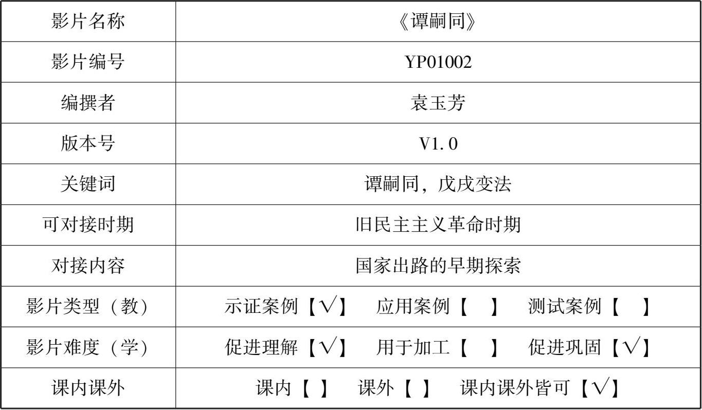 《谭嗣同》以谭嗣同为中心人物,再现了戊戌变法的史实,歌颂了仁人志士慷慨就义、献身民族的崇高精神。1894 年甲午一役,中国战败。1895 年(光绪二十一年)4 月 17 日,由于清政府的腐败无能和妥协退让,签订了丧权辱国的《马关条约》,中华民族危机进一步加深,亡国灭种的危急形势迫使一些先进的中国人开始寻找新的救国救民道路。谭嗣同等维新人士在清光绪帝的支持下发动维新变法运动,以期效法日本践行君主立宪制,然而,变法遭到以慈禧太后为首的保皇顽固派的阻挠,最终失败。“戊戌维新”运动是一次爱国救亡运动。维新派的政治实践和思想理论,不仅贯穿着强烈的爱国主义精神,而且推动了中华民族的觉醒。“戊戌维新”运动虽然未能成功地建立起资本主义的君主立宪制度,其颁布的促进民族资本主义发展的若干措施也未能生效,但在政治、经济等领域一定程度上冲击了封建制度。“戊戌维新”的失败不但暴露了这个阶级的软弱性,而且再次暴露出清朝统治集团的腐朽和顽固,同时也说明在半殖民地半封建的旧中国,企图通过统治者走自上而下的改良实现国家的独立、民主、富强是根本行不通的。要想争取国家的独立、民主、富强,必须用革命的手段,推翻帝国主义、封建主义联合统治的半殖民地半封建的社会制度。