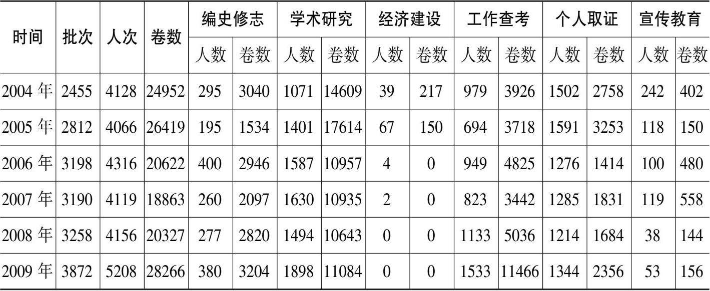 表3-1 北京市档案馆2004年至2009年利用目的统计表