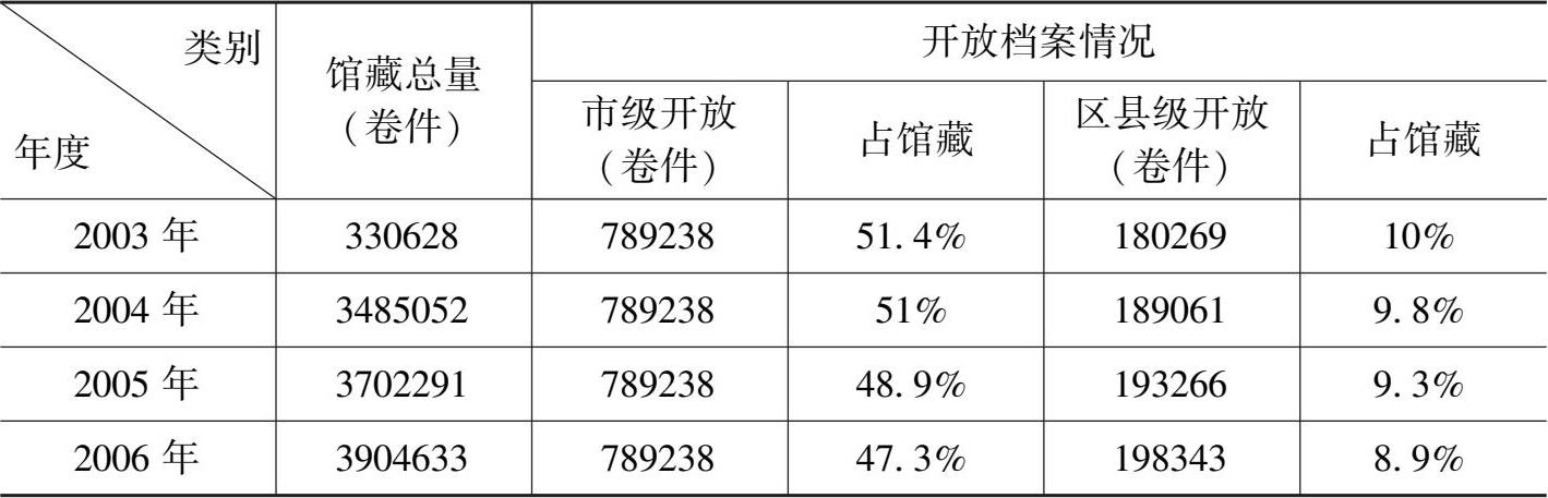 表3-2 2003~2006年北京市各级档案馆总体馆藏开放情况表