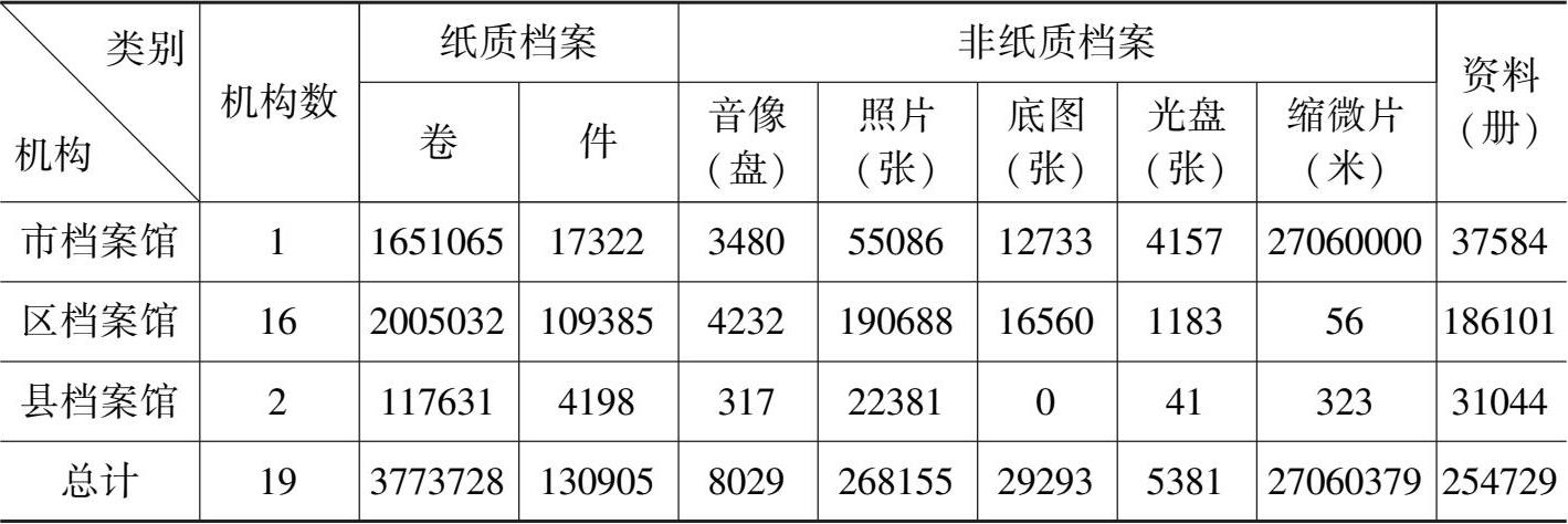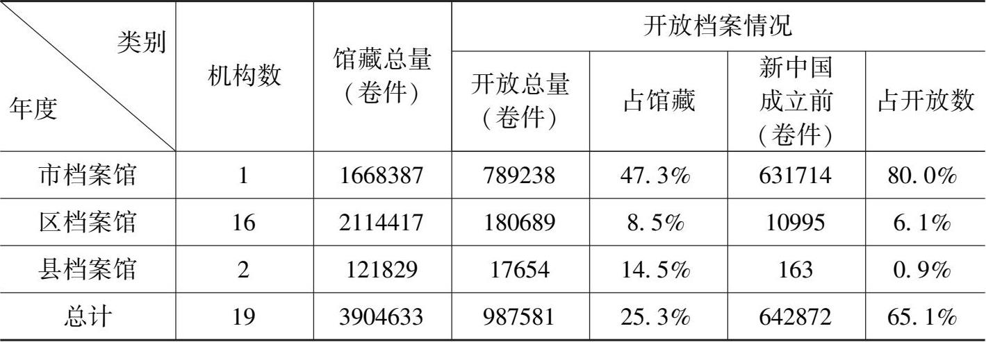 我们以北京市区县级档案馆为例,对近年来其馆藏档案及开放档案情况进行调查,将结果统计如下(见表3-2、3-3):