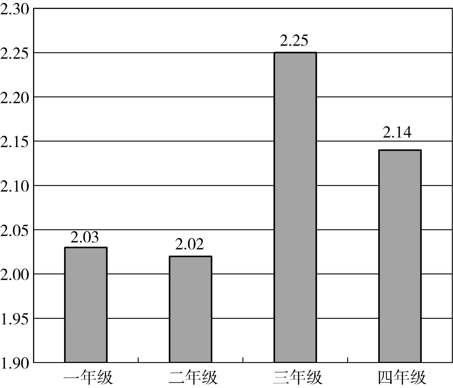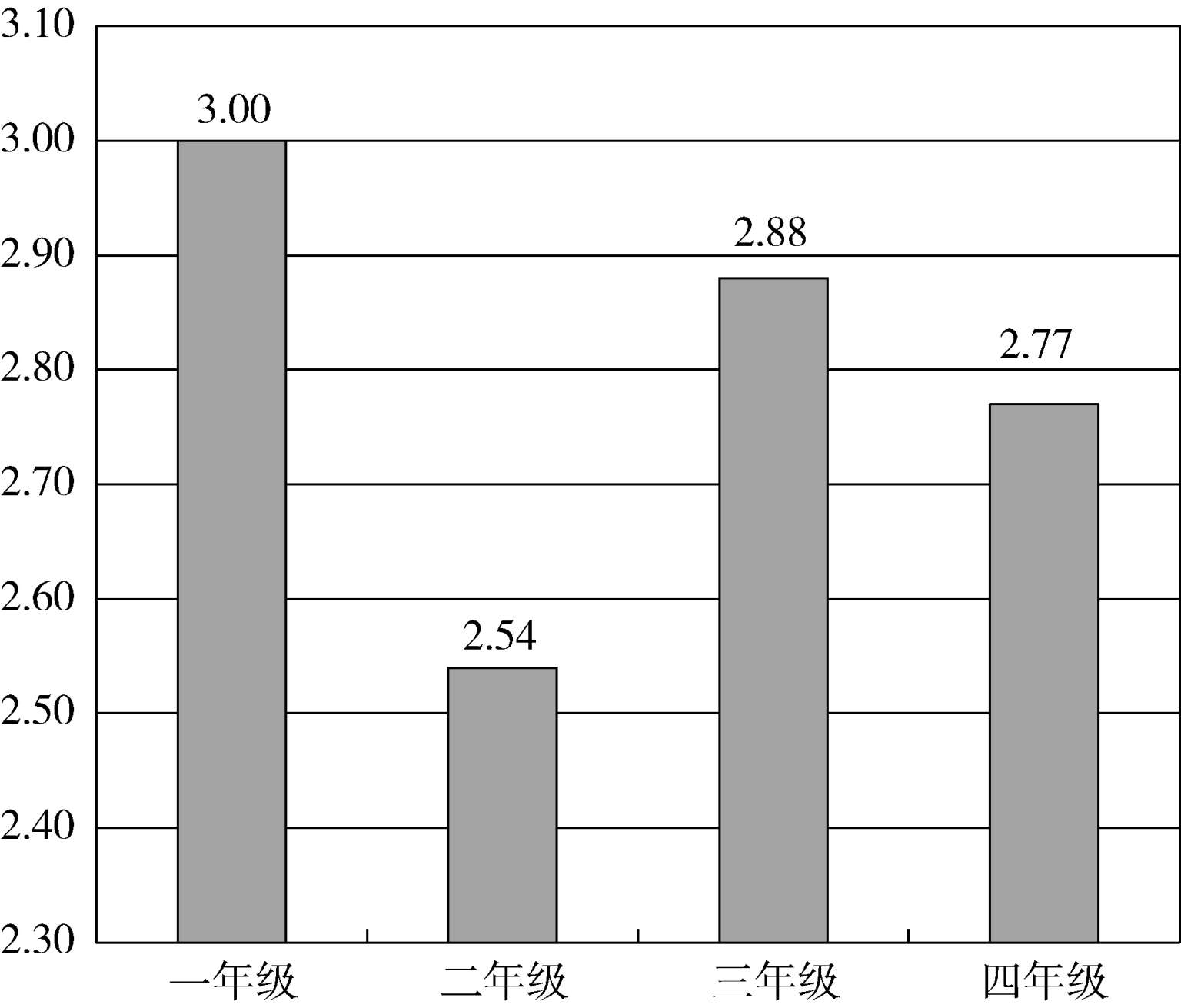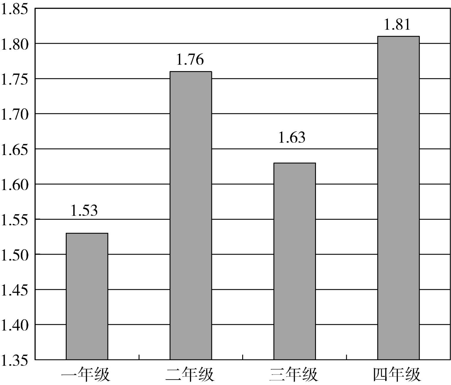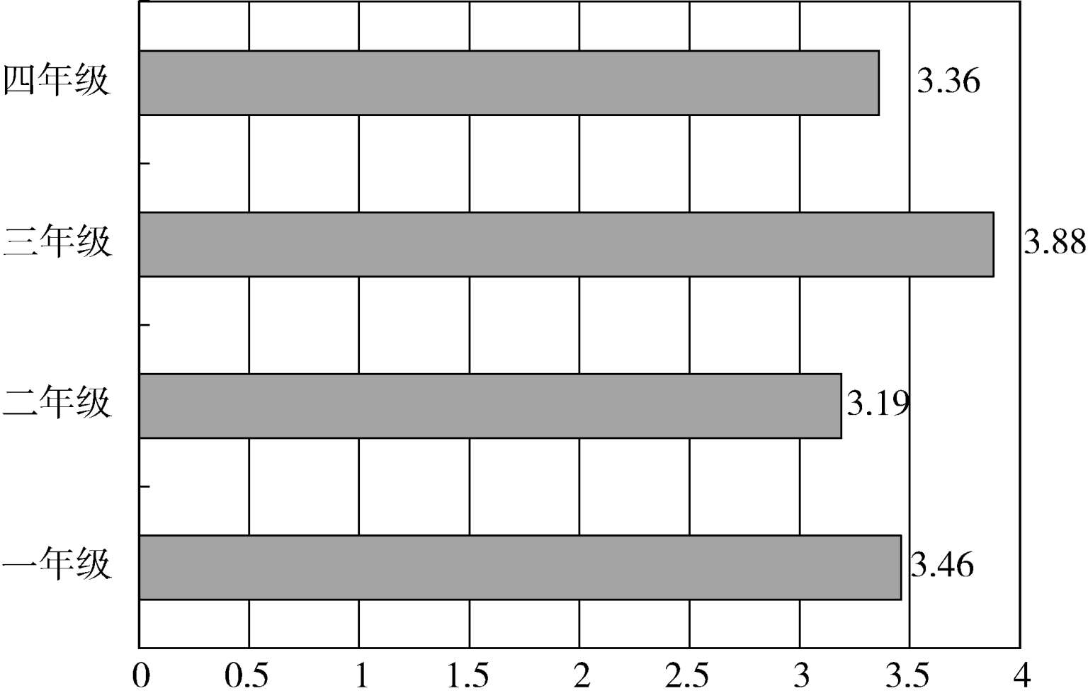 对比四个年级的情况,如图9所示,差异并不十分显著,一年级略低,二年级和四年级略高。