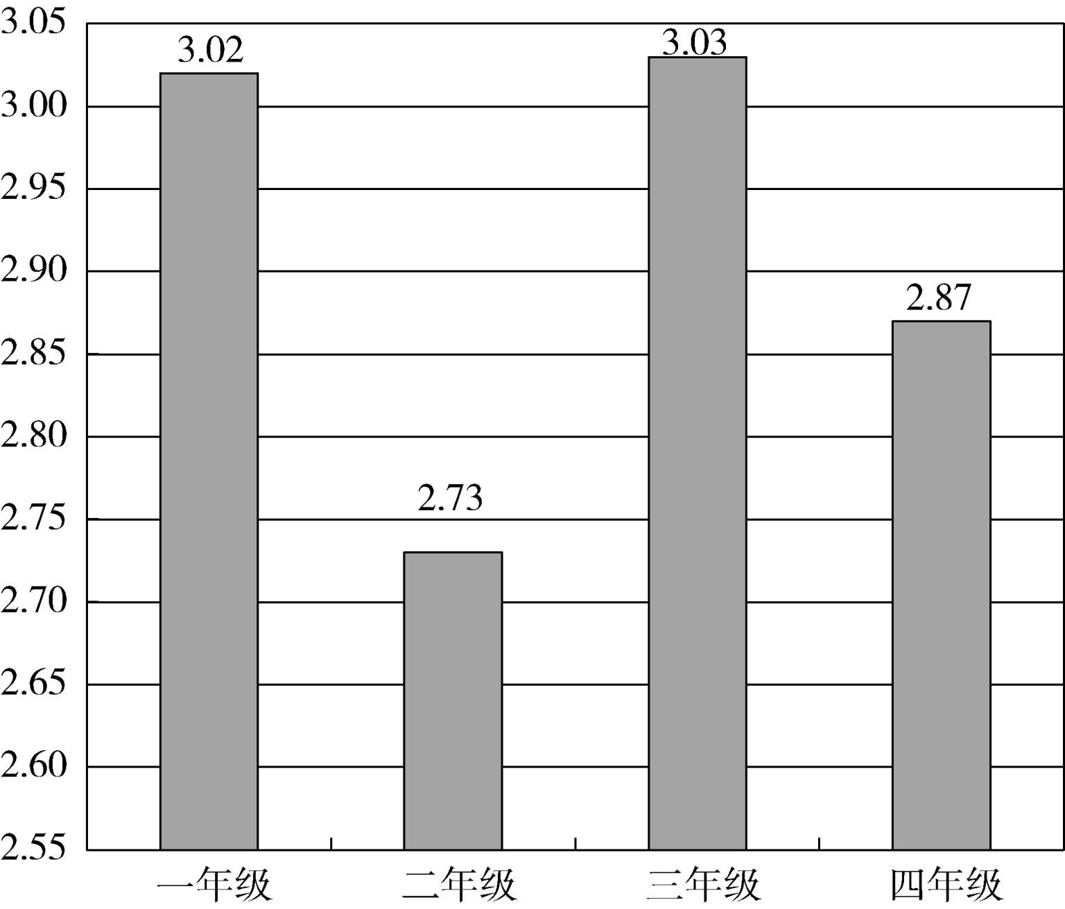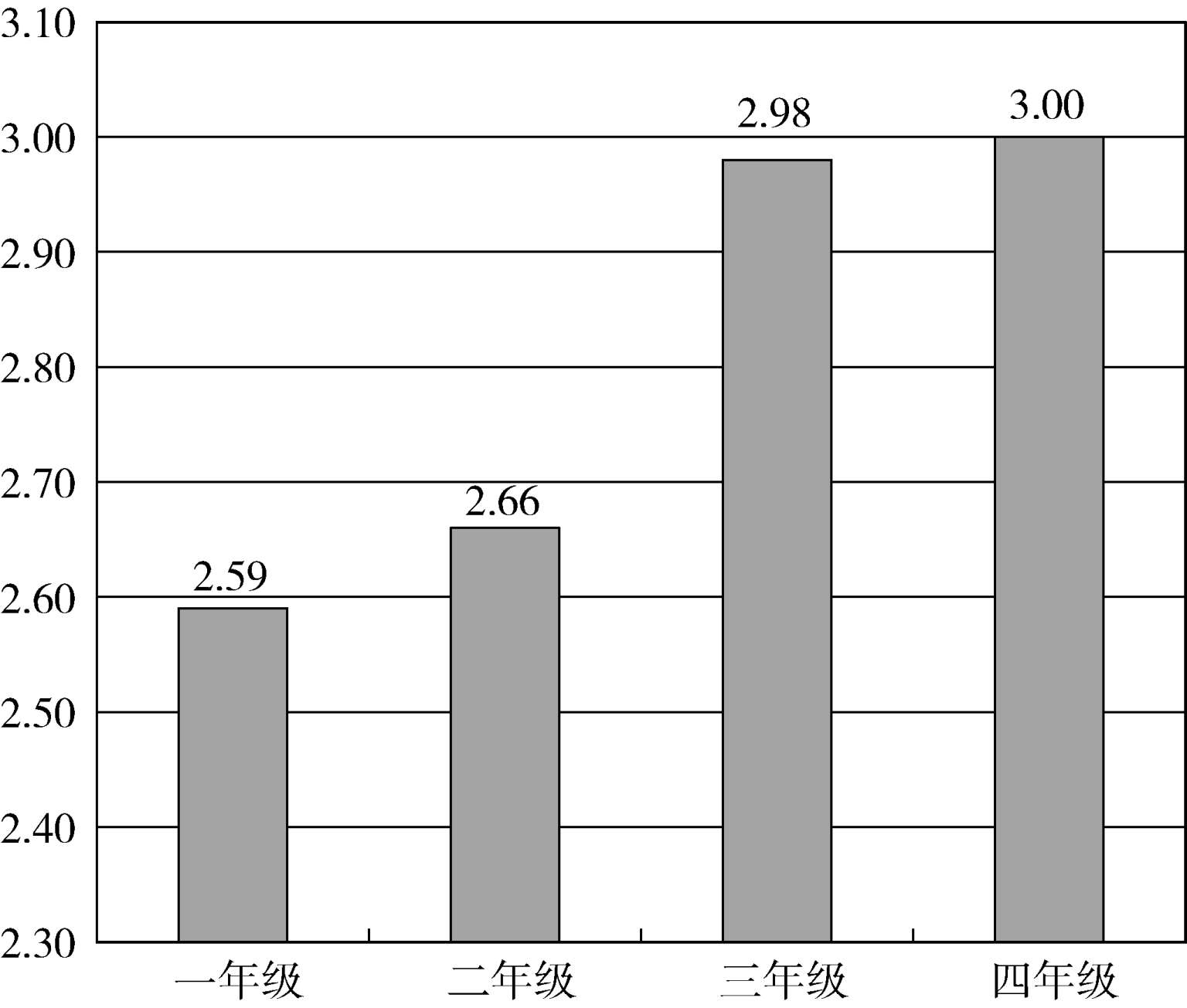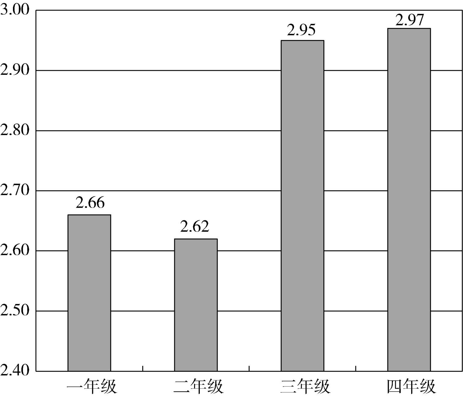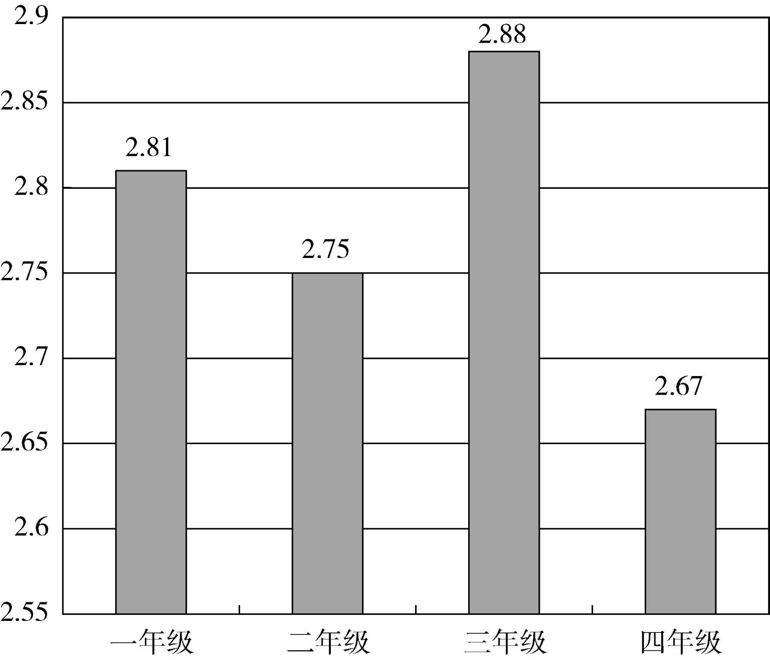 对比四个年级的情况,如图9所示,差异并不十分显著,一年级略低,二年级和四年级略高。