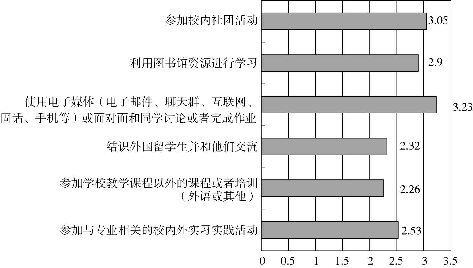 第8~13题,测量的是学生课外学习行为的情况。这6道题每一题的总均值如图4所示。可以看出,得分较高的是“使用电子媒体(电子邮件、聊天群、互联网、固话、手机等)或面对面和同学讨论或者完成作业”3.23分,其次是“参加校内社团活动”3.05分,这反映出学生更多地通过一定的活动平台与自己的同辈之间建立起合作学习的关系。“利用图书馆资源进行学习”2.90分,也高于理论平均分,反映出大部分学生能够对图书馆资源进行利用。“参加与专业相关的校内外实习实践活动”2.53分,基本处于理论平均分的水平,院系一直在致力于为学生创造实习实践的机会,学生也积极参与,但是由于各种主客观原因,并不是所有学生都能够获得足够的实习实践机会。“参加学校教学课程以外的课程或者培训(外语或其他)”2.26分,“结识外国留学生并和他们交流”2.32分,这两项分数均低于理论平均分,即课堂之外,很多学生未能通过自己的主动行动寻找机会提升自我的知识和能力。