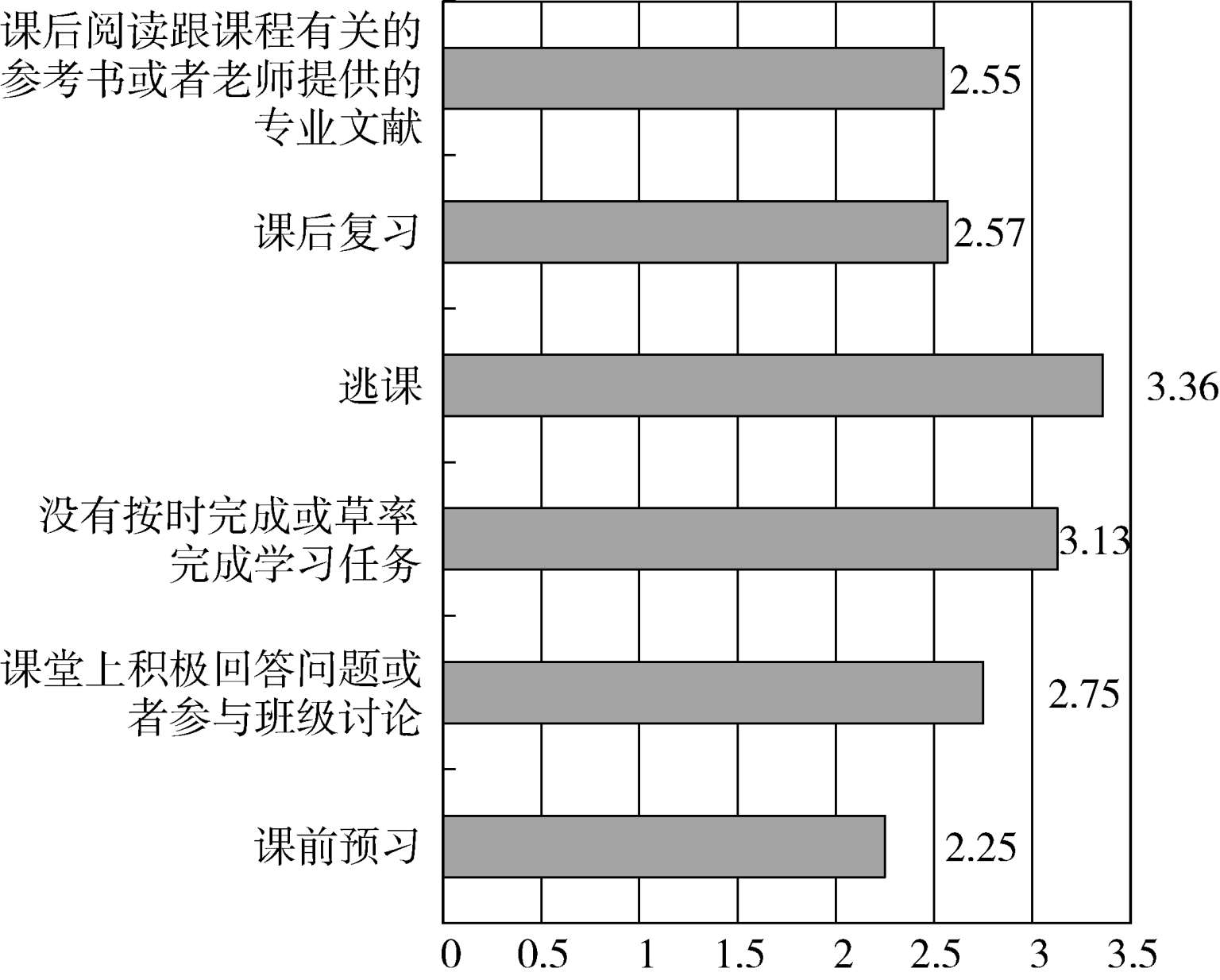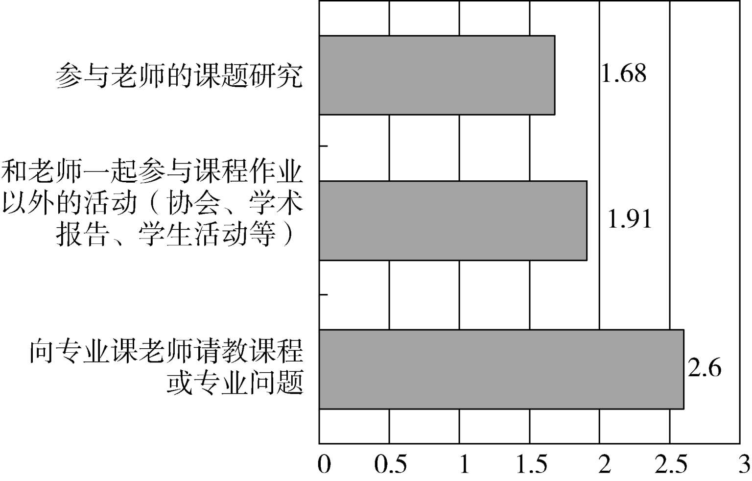 第14~16题,测量的是师生互动学习行为的情况。这3道题每一题的总均值如图6所示。可以看出,得分较高的是“向专业课老师请教课程或专业问题”2.6分,略高于理论平均分,而“和老师一起参与课程作业以外的活动(协会、学术报告、学生活动等”)1.91分,“参与老师的课题研究”1.68分,则明显低于理论均值。这反映出师生互动学习行为的欠缺。对于大部分学生来说,他们能够就课程相关问题向教师请教,但是对课程以外参与教师的学习、科研活动的情况就十分欠缺了。