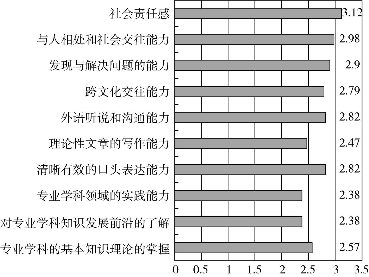 第46~55题,测量的是学生通过本专业学习获得的知识和能力发展的情况。这10道题每一题的总均值如图16所示。总体上看,这一组题目的得分保持在理论平均分上下,最高的是“社会责任感”3.12分。其中,低于理论平均分的有“对专业学科知识发展前沿的了解”2.38分,“专业学科领域的实践能力”2.38分,“理论性文章的写作能力”2.47分,学生的自我评价反映出他们认为在这几方面的发展并不十分理想。汉语国际教育是实践性较强的专业,因此学生对自我的实践能力的期待较高,而对学术性、理论性强的问题不十分重视。因此,我们的教学中在这两方面还需要做出更多的努力。前面“介绍本学科发展的前沿动态”得分是3.34分,说明教师在课堂教学中已经做出一定的努力,但是对学生课下的要求和指导有所不足。在学术性论文的写作方面,学生的自我评价也较低,在我们的教学中,对学生学术论文写作的训练比较欠缺,大学四年真正意义上的科研训练和论文写作只有毕业论文。其他几道题目的得分分别是,“专业学科的基本知识理论的掌握”2.57分,“清晰有效的口头表达能力”2.82分,“外语听说和沟通能力”2.82分,“跨文化交往能力”2.79分,“发现与解决问题的能力”2.90分,“与人相处和社会交往能力”2.98分。除“专业学科的基本知识理论的掌握”之外的其他几道题目反映出学生的综合能力得到了一定程度的发展。