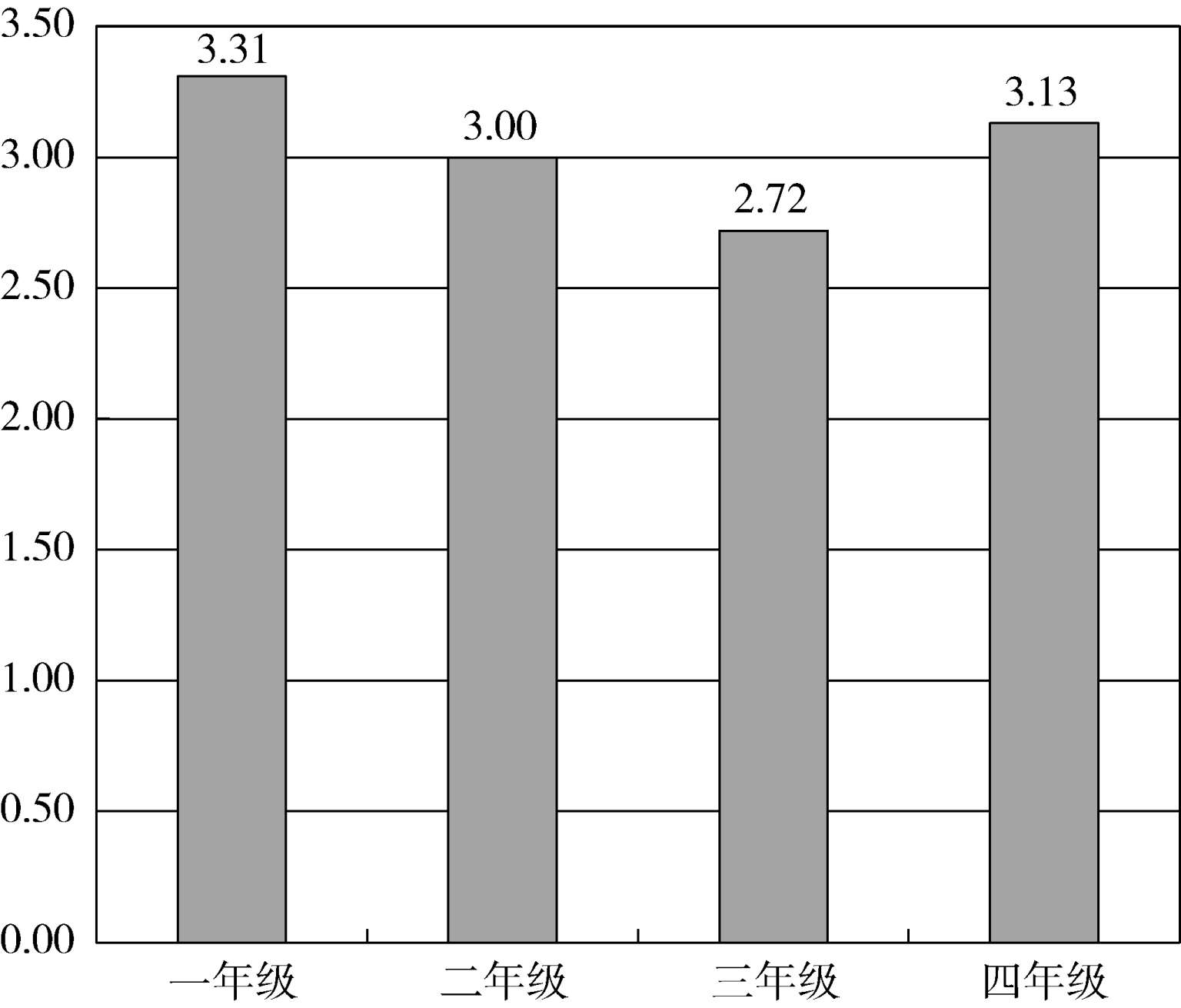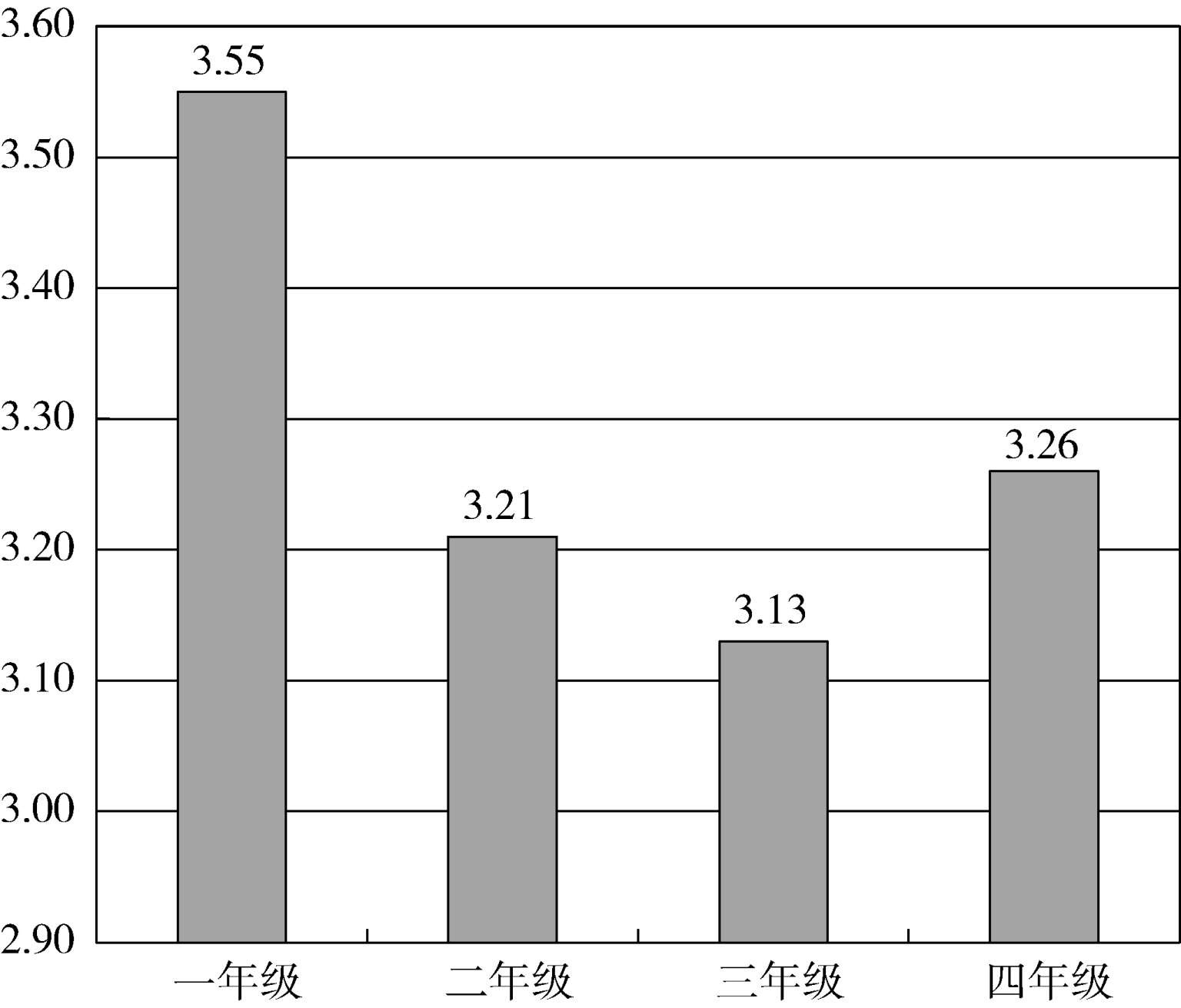 各年级的情况,如图13所示,评价最高的是一年级,二、三、四年级略有下降,但均在3分以上。