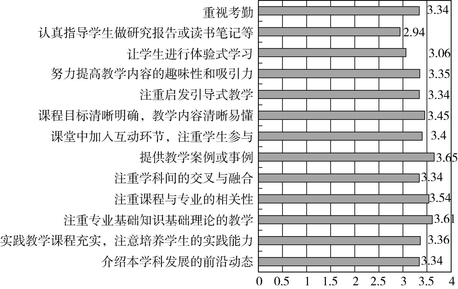 第26~38题,测量的是学生对教师课堂教学行为的评价。这13道题每一题的总均值如图12所示。总体上看,学生对教师课堂教学行为的评价较高,都在理论平均值之上,而且,除“认真指导学生做研究报告或读书笔记等”2.94分,低于3分,其他题目的得分均高于3分。这表明,教师努力认真地上课,并得到了学生的认可。其中,得分最高的前两道题目是“提供教学案例或事例”3.65分,“注重专业基础知识基础理论的教学”3.61分,这两道题的高分反映了教师在教学中对基础知识基础理论以及教学实践两方面都给予了充分的重视。其余题目的得分分别是“介绍本学科发展的前沿动态”3.34分,“实践教学课程充实,注意培养学生的实践能力”3.36分,“注重课程与专业的相关性”3.54分,“注重学科间的交叉与融合”3.34分,“课堂中加入互动环节,注重学生参与”3.4分,“课程目标清晰明确,教学内容清晰易懂”3.45分,“注重启发引导式教学”3.34分,“努力提高教学内容的趣味性和吸引力”3.35分,“让学生进行体验式学习”3.06分,“重视考勤”3.34分。